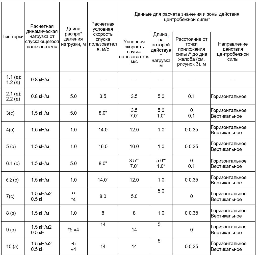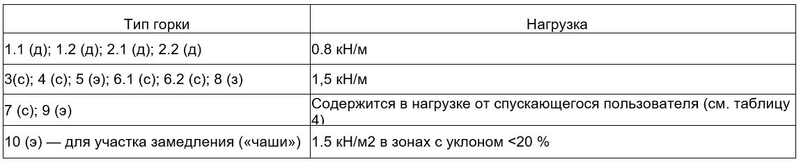 8.1.3 Значения расчетных статических нагрузок от пользователей водных горок указаны в таблице 5.