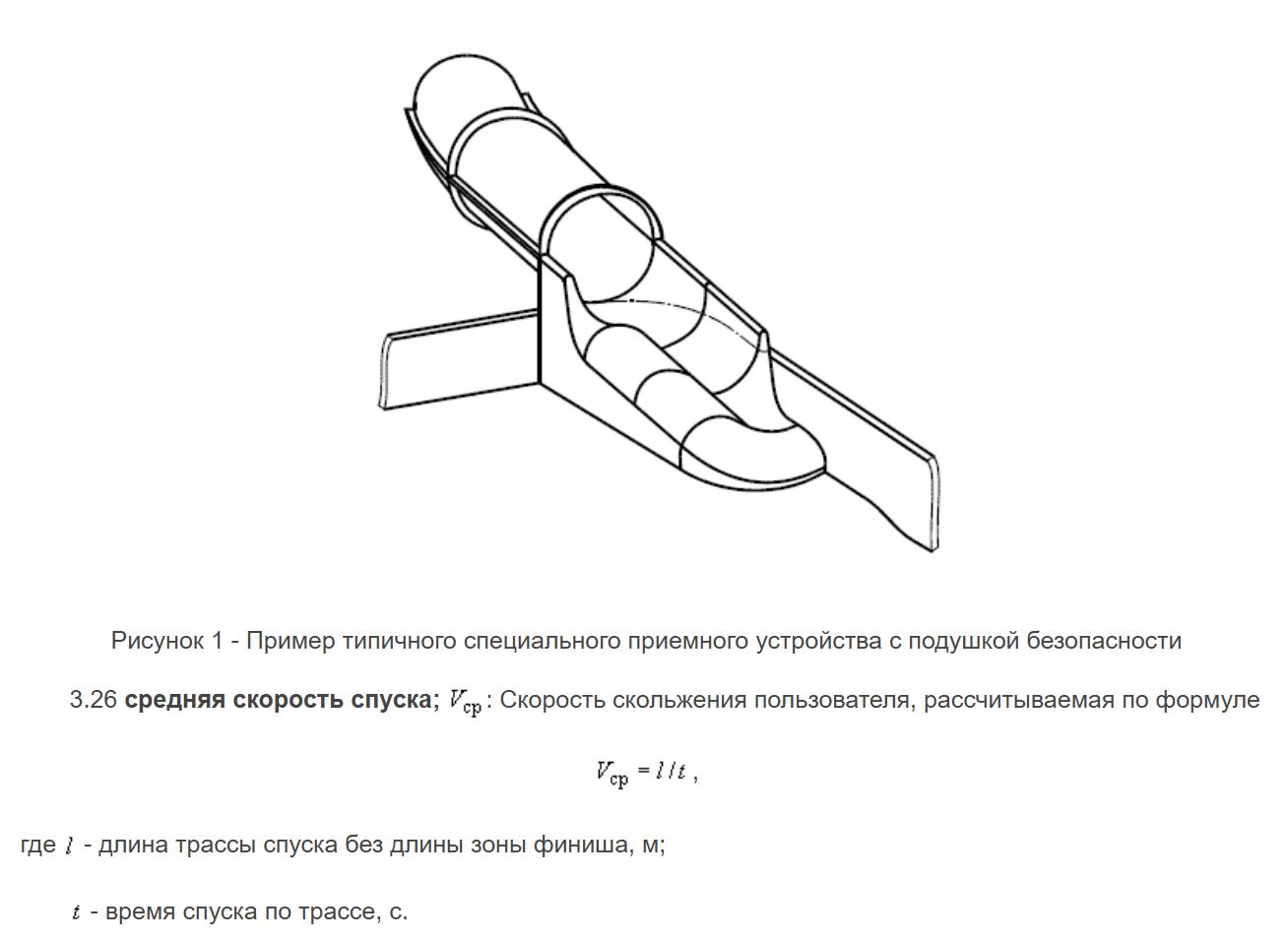 Специальное приемное устройство может быть использовано на любой водной горке, классифицированной согласно таблице 2. за исключением горки типа 10 (э). и обязательно должно быть установлено на горках, когда скорость пользователя на выходе с трассы спуска превышает 10 м/с.