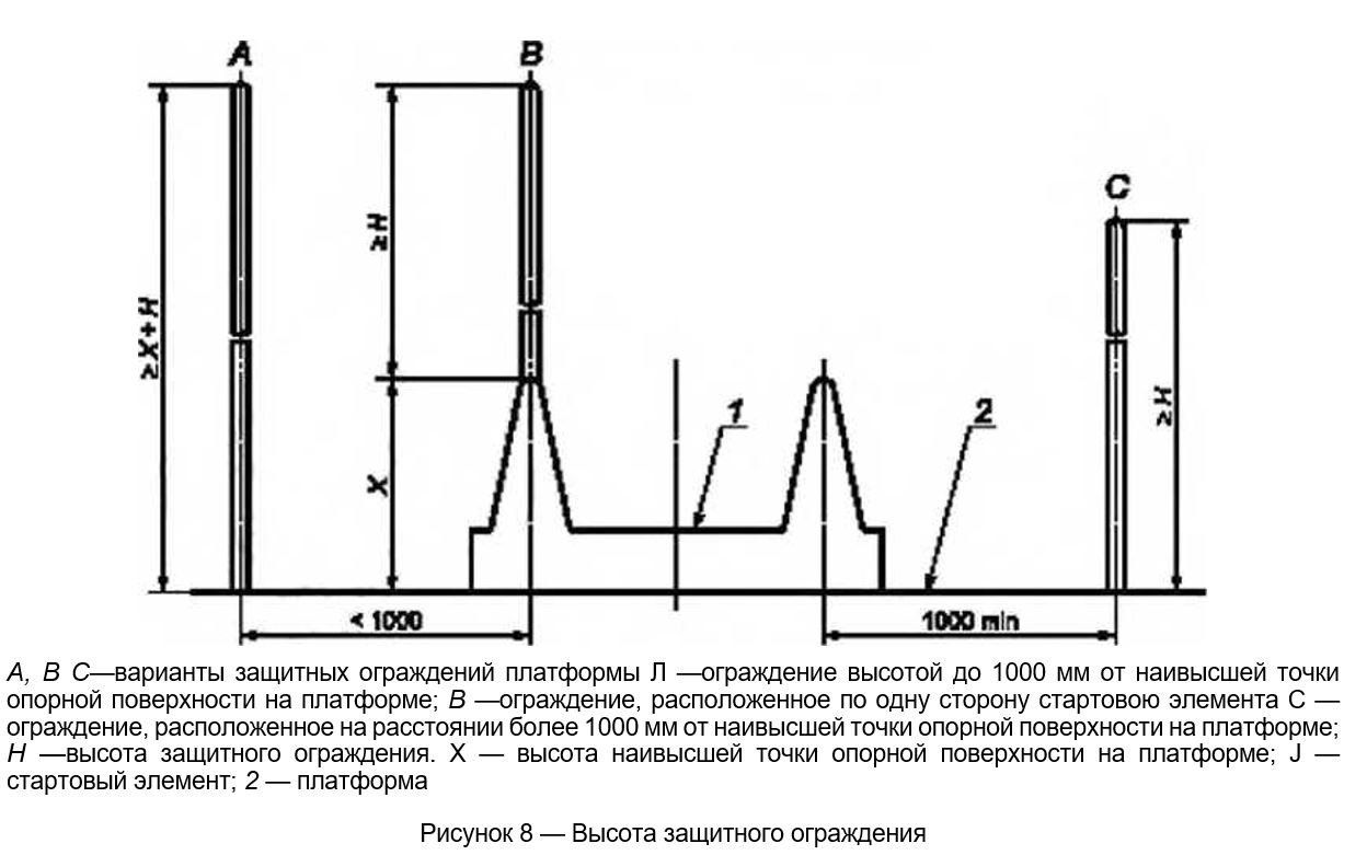 Верхняя кромка ограждения должна быть непрерывной и обеспечивать защиту по всему периметру платформы, включая боковые стороны, примыкающие к стартовому элементу.