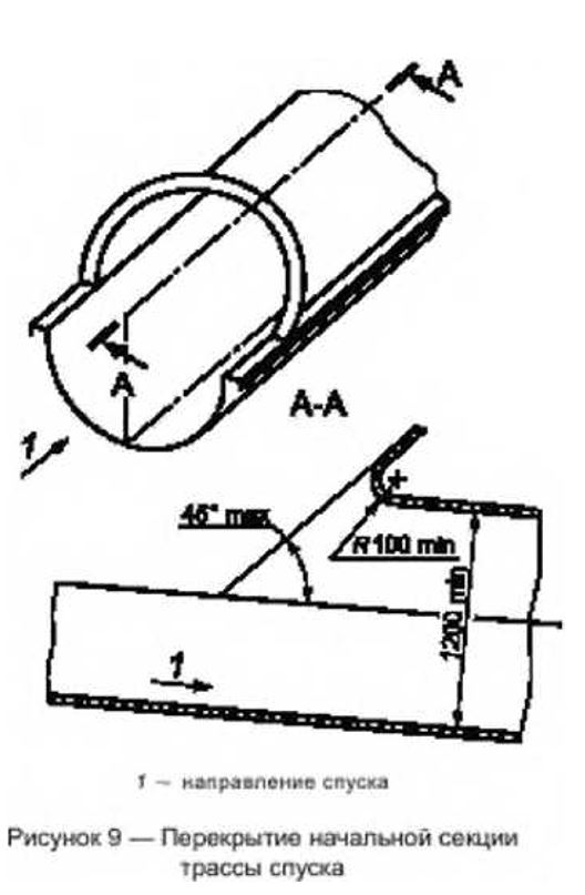 8.5.7 Начальная секция трассы спуска, имеющей профиль трубы, должна соответствовать рисунку 9. Верхняя кромка перекрытия, образующая доступ на трассу, должна иметь скос под углом не более 45 градусов и закругление с радиусом не менее 100 мм. Эта кромка может быть дополнительно оснащена средствами обмягчения. Высота на входе должна быть не менее 1200 мм. На расстоянии не менее 1000 мм от верхней кромки перекрытия создают его плавный переход от высоты входного отверстия к номинальному диаметру трубы.
