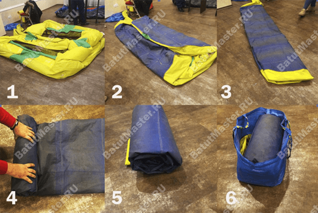 - Перед тем, как вы скрутите батут, площадку обязательно следует надуть часов на 5, чтобы хорошо просушить и провести сухую уборку. Затем конструкцию можно сдуть и сложить следующим образом: