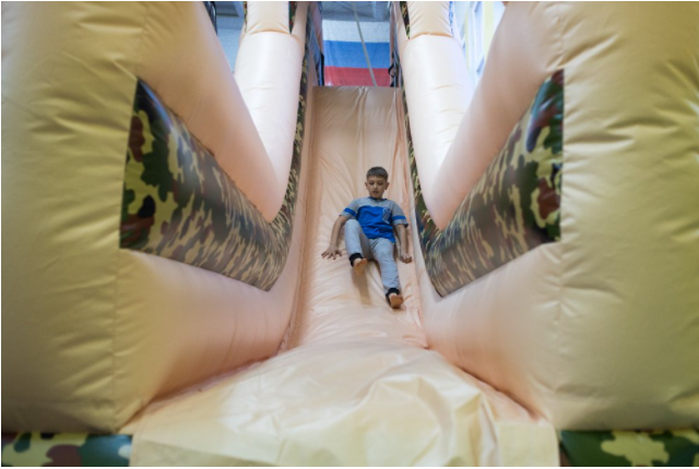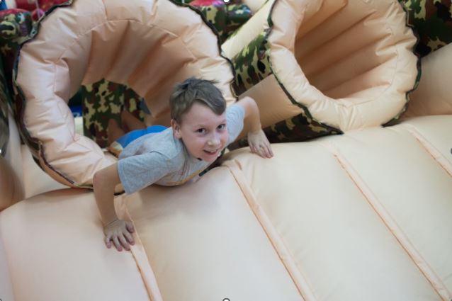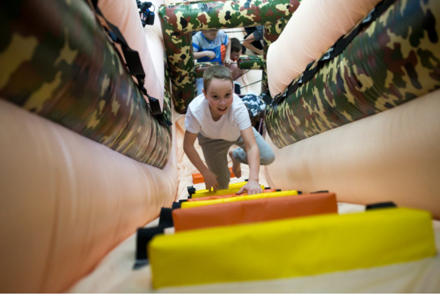 Полоса препятствий представляет собой внушительный надувной комплекс длиной 25 метров. Она включает в себя различные элементы: барьеры, ров, возвышенность, «минное поле» и заграждения. Преодоление полосы позволяет детям в игровой форме развивать ловкость, выносливость и готовиться к будущей службе в армии.