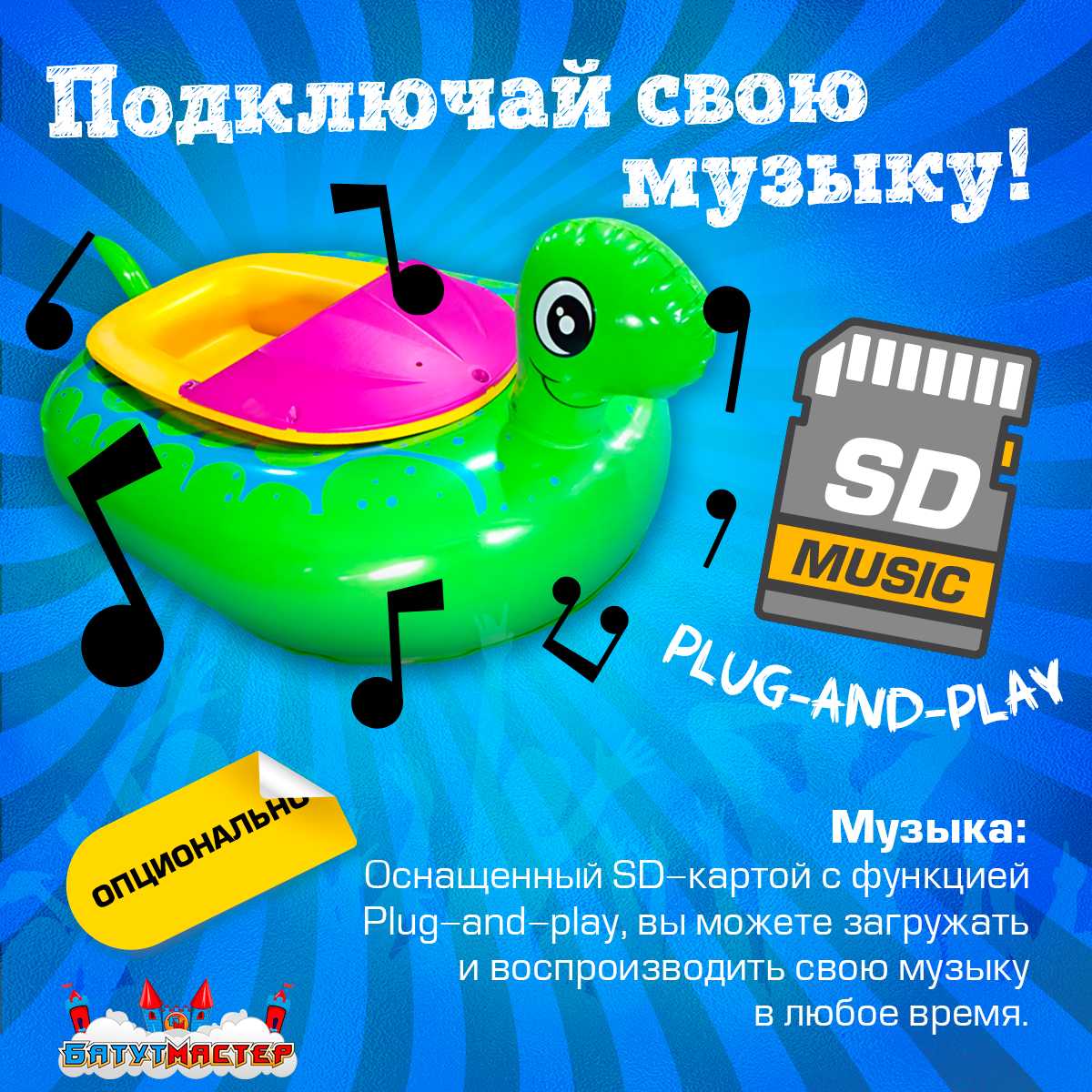 Дополнительно лодка оснащена музыкальным модулем с SD-картой, позволяющим воспроизводить музыку во время катания. Это создаёт праздничную атмосферу и делает аттракцион ещё более привлекательным для детей.