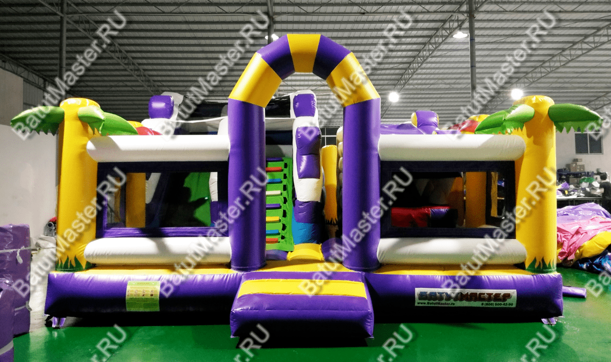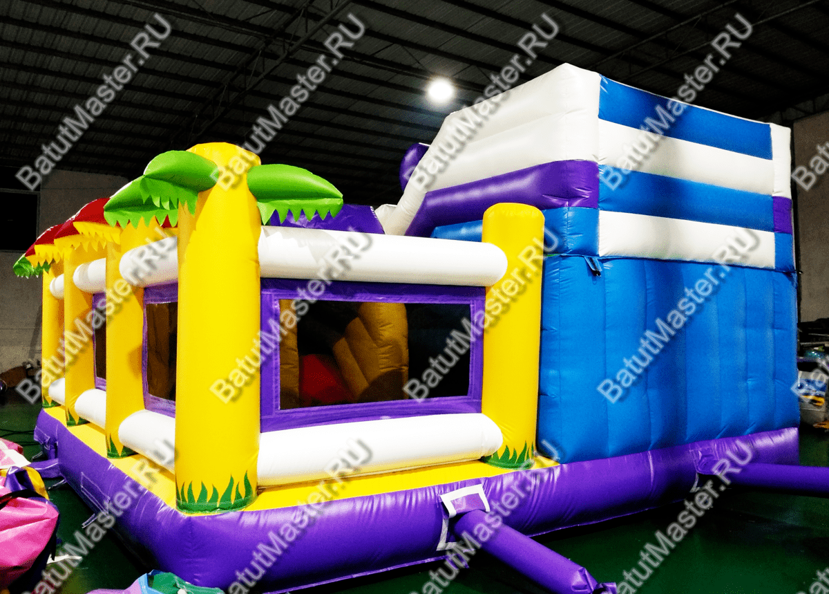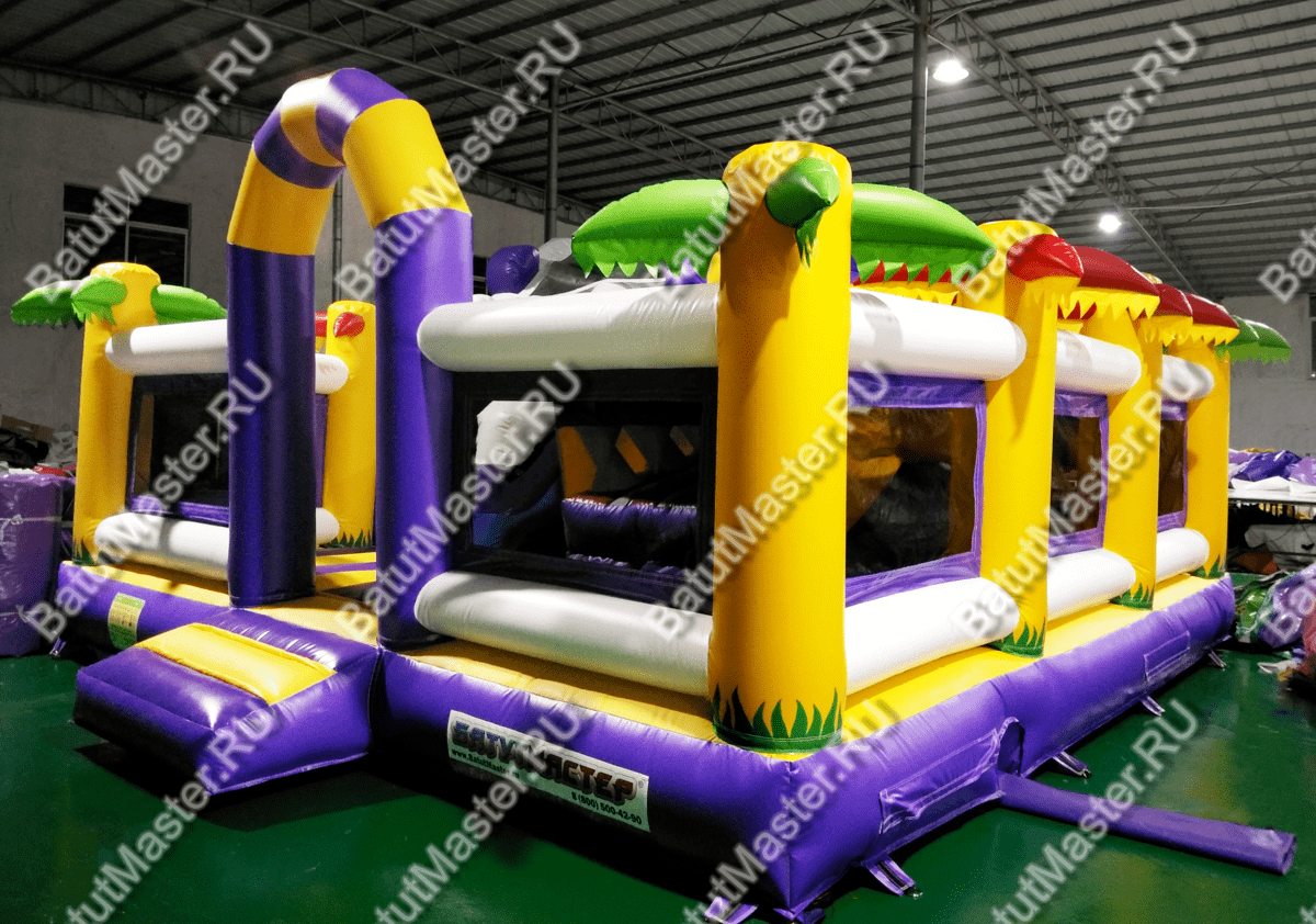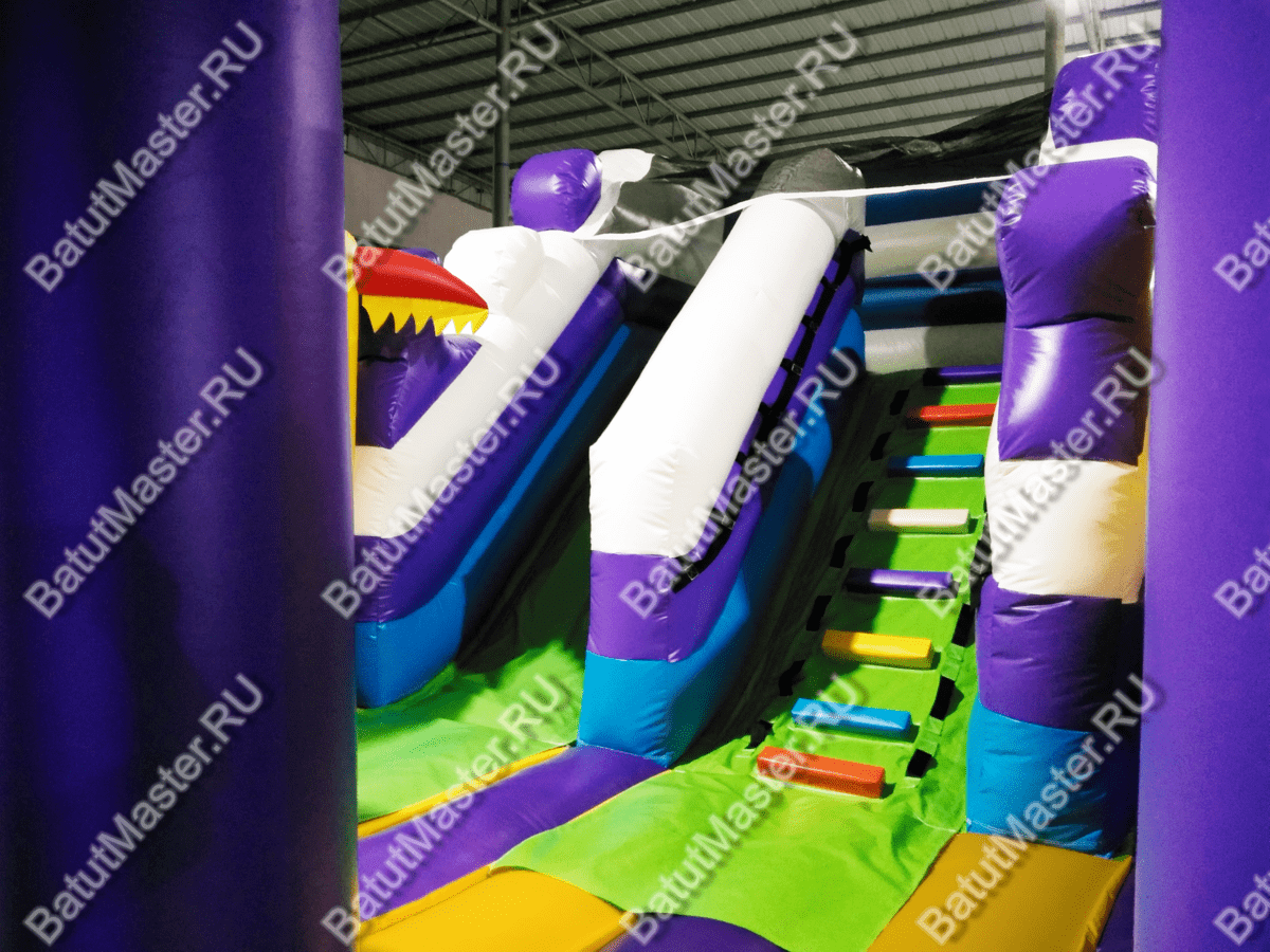 Внутри батута дети смогут весело провести время, ведь там их ждёт огромная механизированная голова, а это точно приведёт ребёнка в восторг. У конструкции подвижная пасть, внутри которой можно ползать. Детское воображение сделает игру с таким аттракционом ещё интересней, и ребёнок не захочет покидать батут. Есть тут также и большая горка, с которой очень весело кататься.