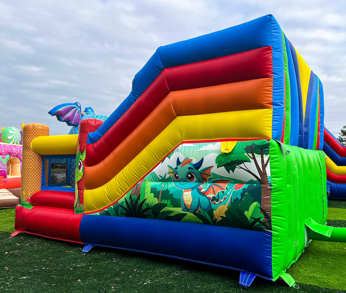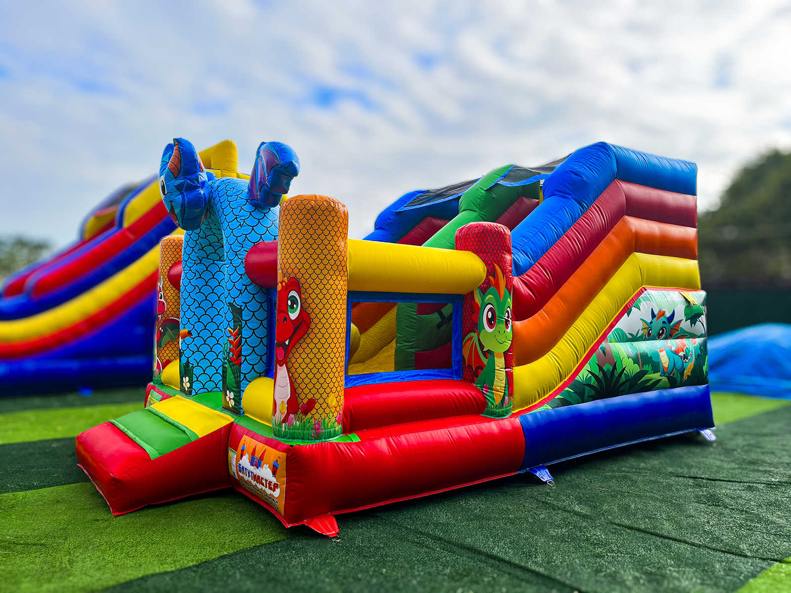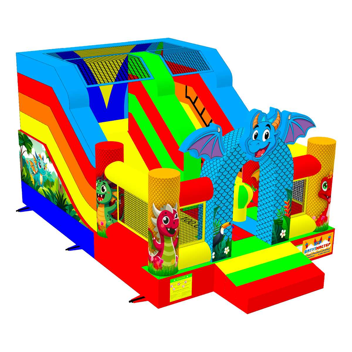 «Дракоша» — это не просто батут, это целая игровая станция в ярком оформлении с забавными дракончиками, которую невозможно пройти мимо. Его привлекательный внешний вид привлекает внимание с первого взгляда: насыщенные цвета, выразительные персонажи и драконий вход в виде арки создают атмосферу сказки и приключений. Этот батут — идеальный выбор для предпринимателей, развлекательных центров, организаторов мероприятий и арендных компаний.