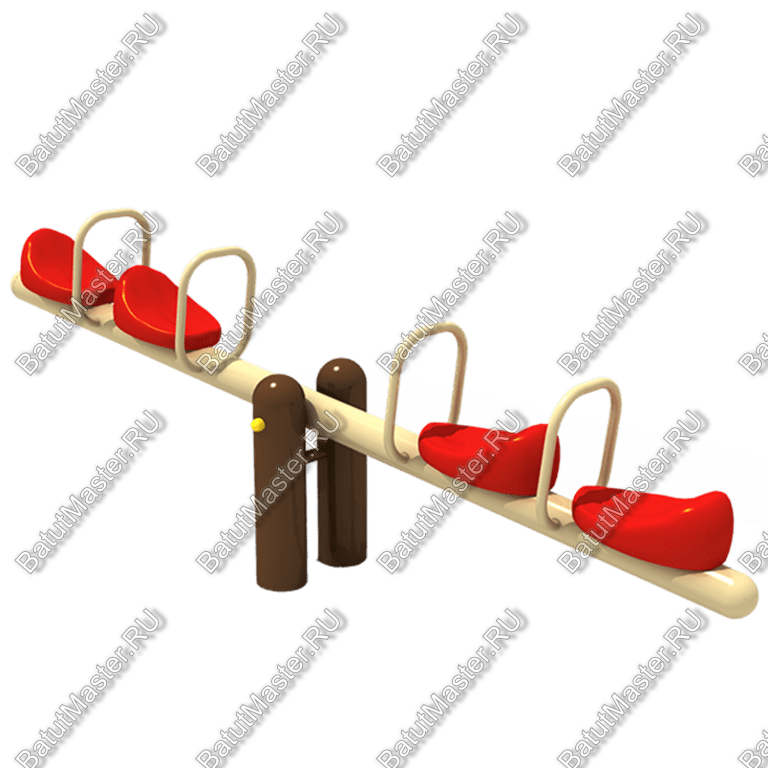 Балансир, который рассчитан на четырех малышей, имеет две пары сидений с тандемным расположением. Они расположены на перекладине друг за другом. Возле каждого сидения имеется поручень для фиксации малыша. Перекладина крепится непосредственно к перемычке между двумя стойками. Такая простая конструкция балансира не вызывает сомнений у взрослых о ее безопасности. У балансира нет ограничителей безопасности, в которых нет необходимости для такой короткой перекладины. Посадка на балансир малышей не вызывает трудностей. Здесь могут раскачиваться четыре малыша одновременно, но при желании можно качаться и двум малышам. Главное чтобы число малышей с одной стороны равнялось числу малышей с другой или же детей вес на обеих сторонах был приблизительно одинаковый.