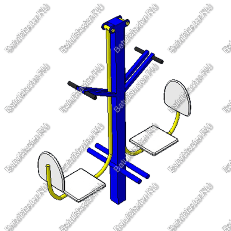 Конструкция изготовлена из стандартных материалов и покрыта защитными грунтовками и порошковыми красками. Этому покрытию не страшно воздействие влаги и ультрафиолета. Сидения изготовлены из фанеры с водостойкой защитой. Габариты конструкции тренажера 1,65 х 0,52 х 1,7 метра. Такие размеры позволяют использовать тренажер на любой спортивной детской площадке. Для эксплуатации тренажера нет необходимости делать специальный защитный навес. Тренажер рассчитан только для открытых площадок.