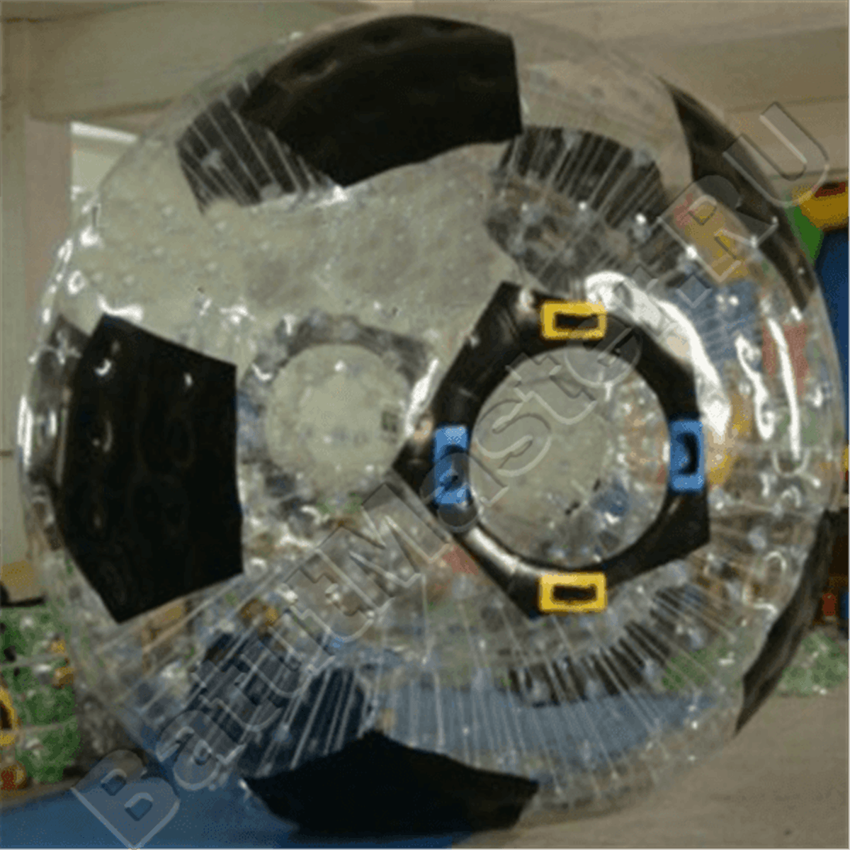 Оригинальный зорб «Футбольный мяч» оформлен в стиле настоящего спортивного снаряда. Изделие из прозрачного материала ПВХ имеет черные вставки в виде многоугольников по всему периметру, а вход обозначен пятиугольником с разноцветными ручками для переноски. Снаружи видны белые соединительные стропы между двумя сферами.
