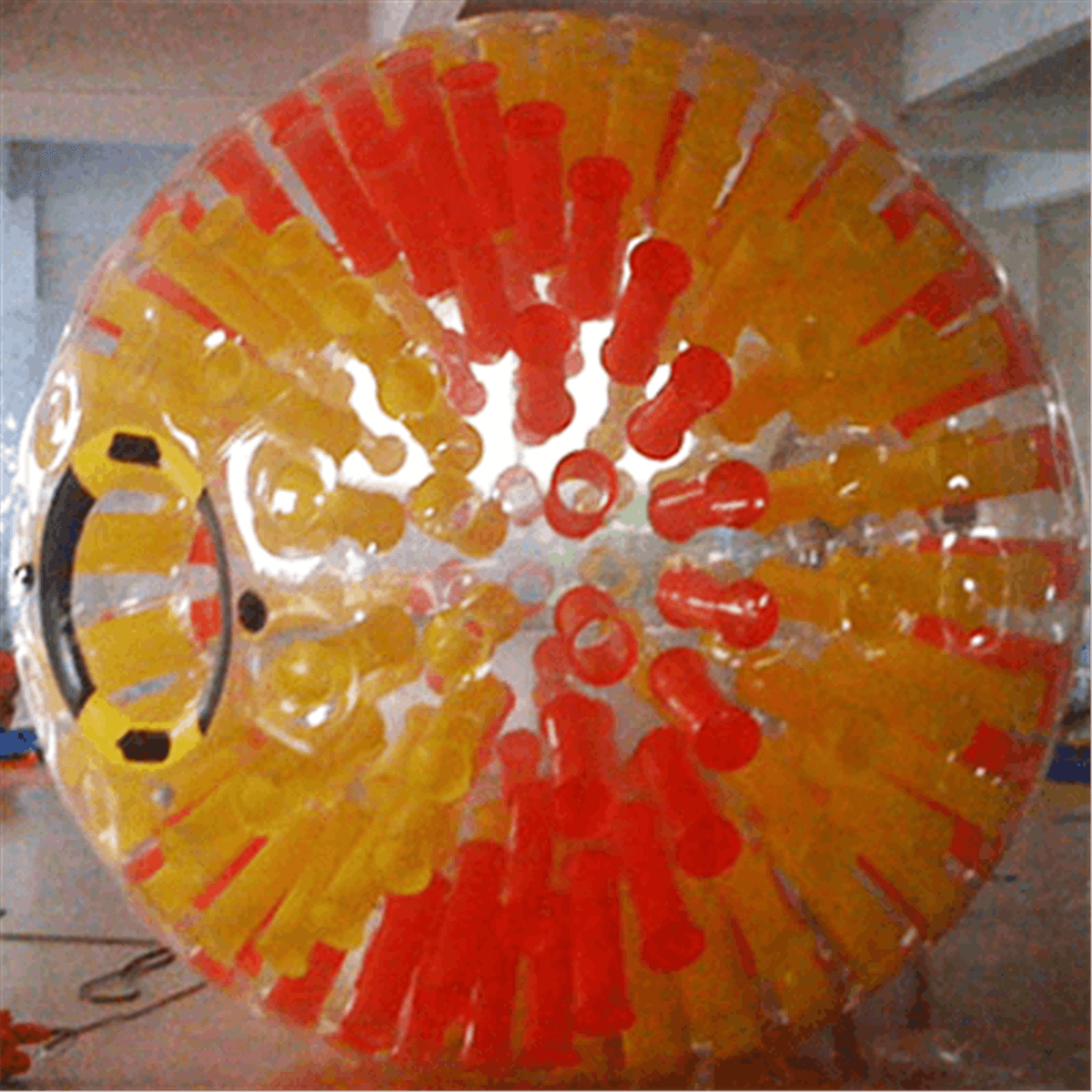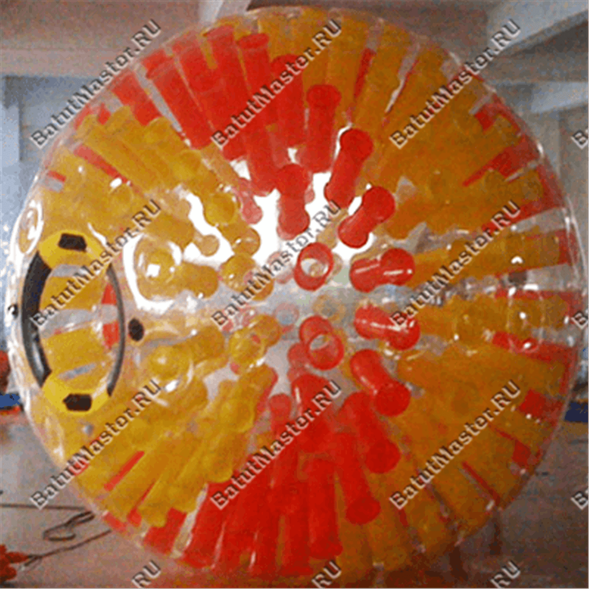 Яркий и необычный зорб «Одуванчик» полностью соответствует своему названию. Между двумя сферами модели расположено множество объемных строп ярко желтого и оранжевого цвета. Внешний слой материала прозрачный, поэтому наполнение внутренней части видно отчетливо, а вот за счет плотного размещения строп друг к другу, пользователь внутри шара практически не заметен.