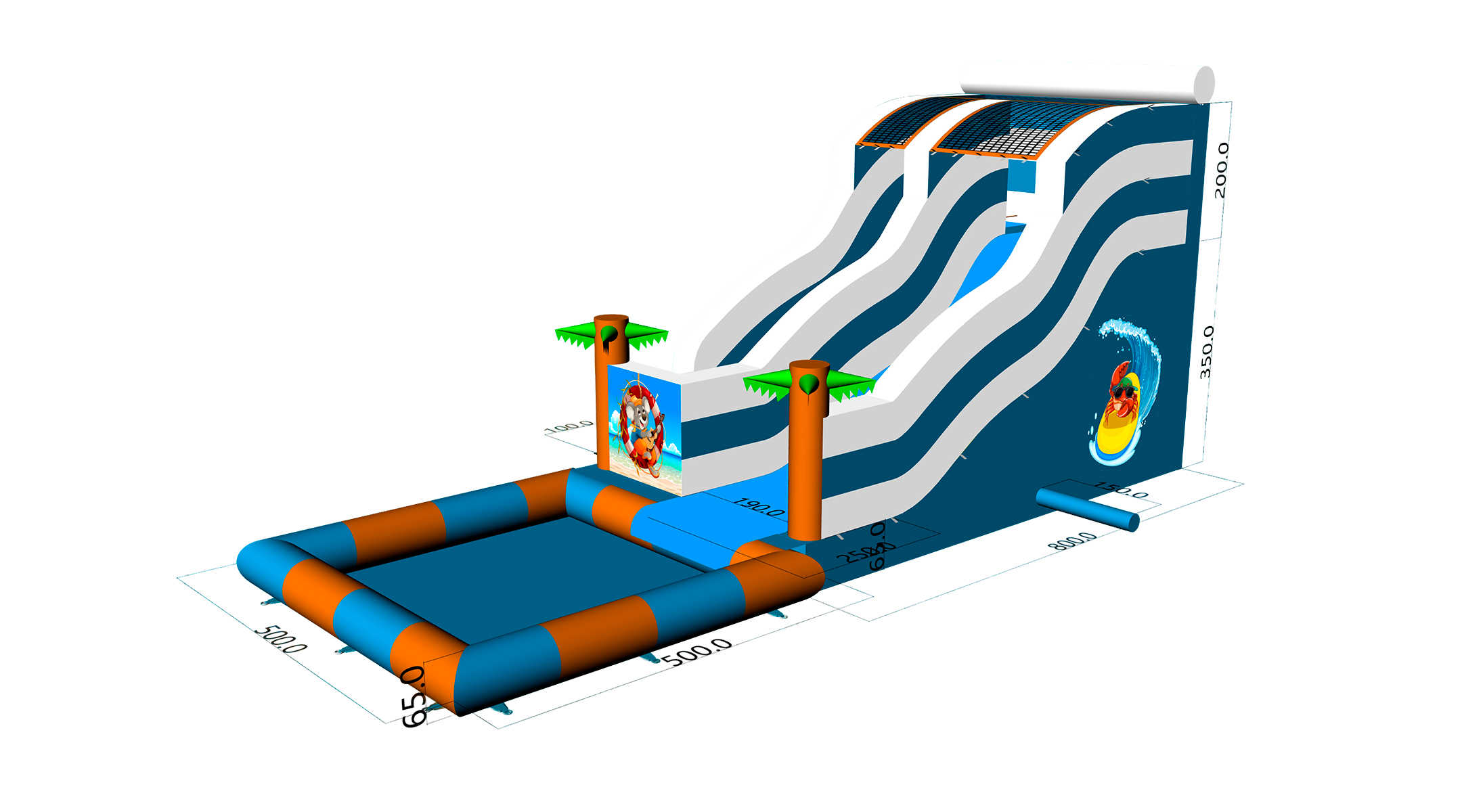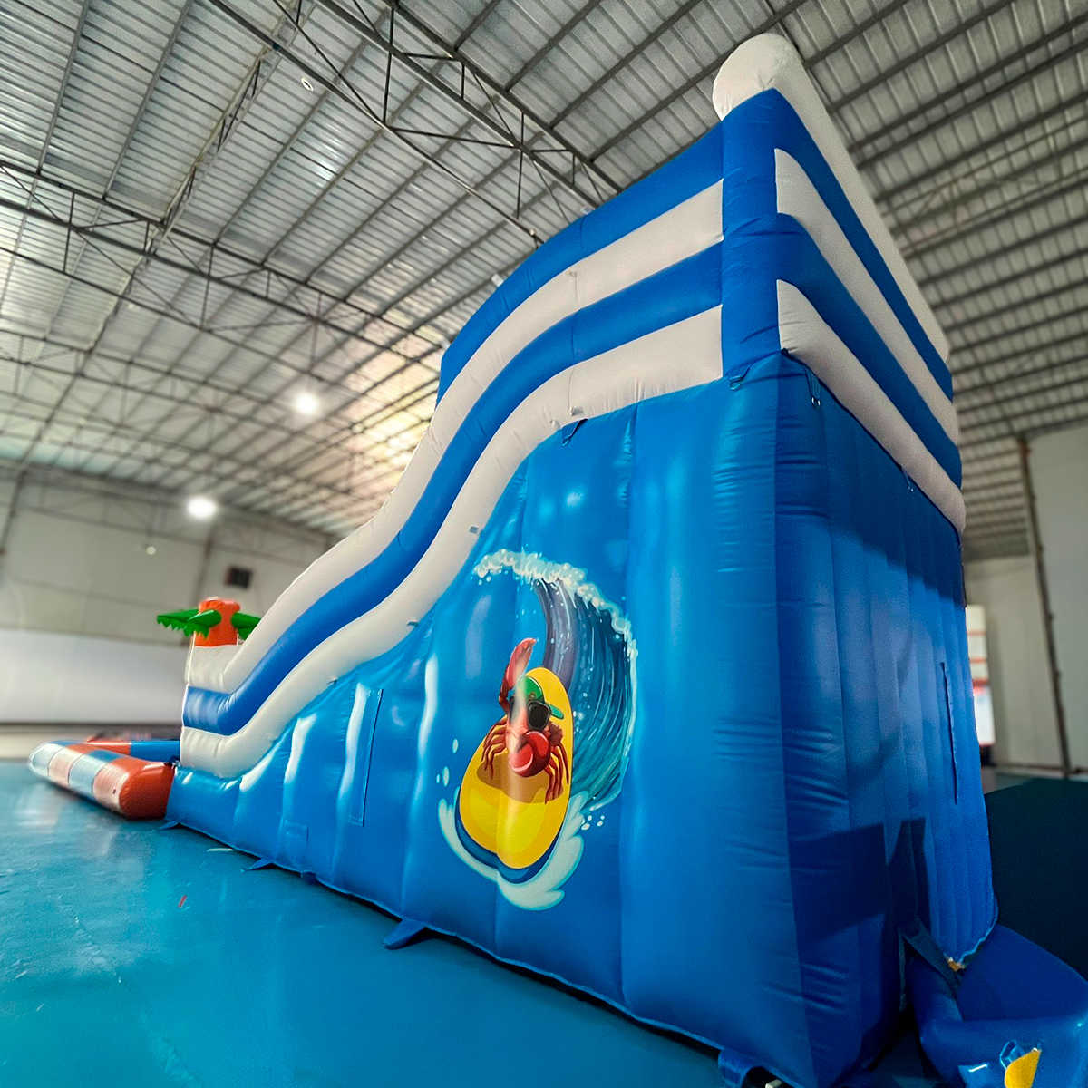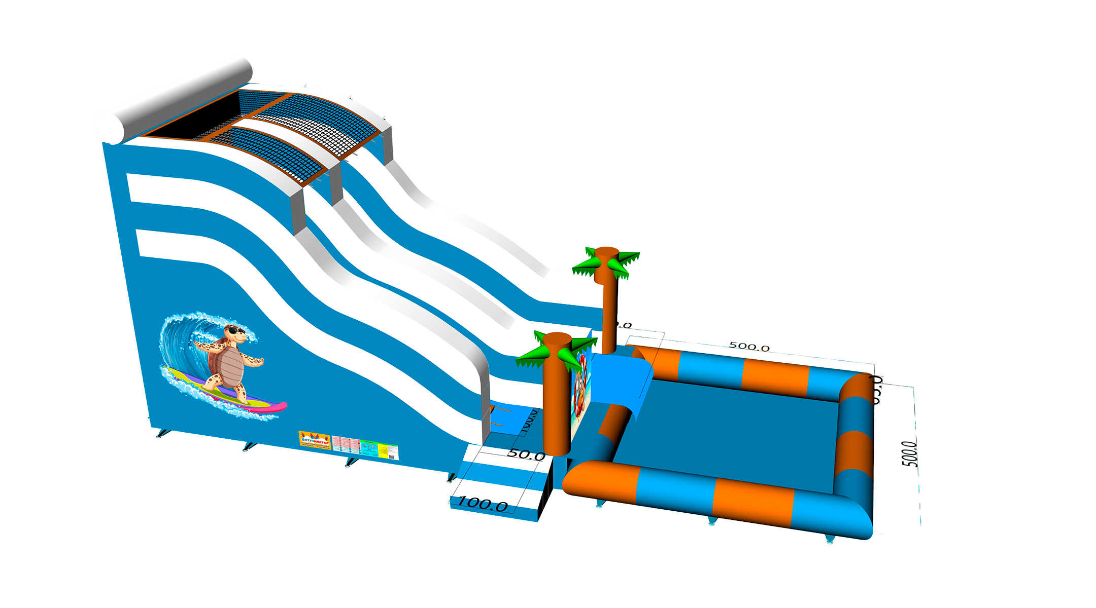 Коммерческий надувной батут с бассейном «Пляжный оазис 3» 13x5x6 — это уникальное сочетание водной горки, большого бассейна и красочного тропического дизайна с пальмами и морскими персонажами. Он создан для ярких эмоций, детского восторга и максимальной коммерческой отдачи. Благодаря своим размерам он привлекает внимание издалека и становится центром притяжения на любых мероприятиях: от городских праздников до частных вечеринок.