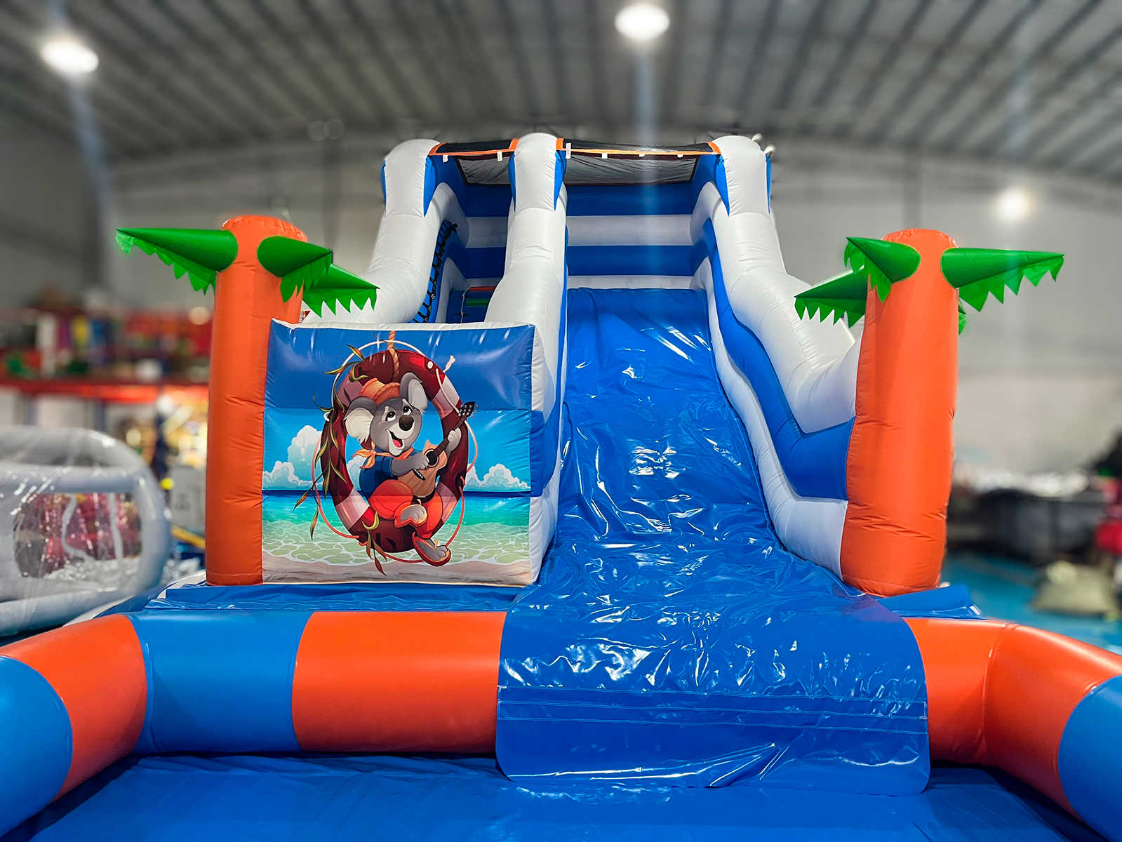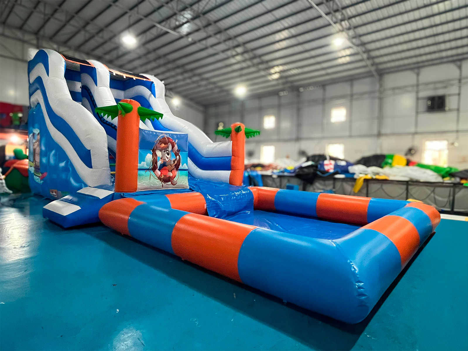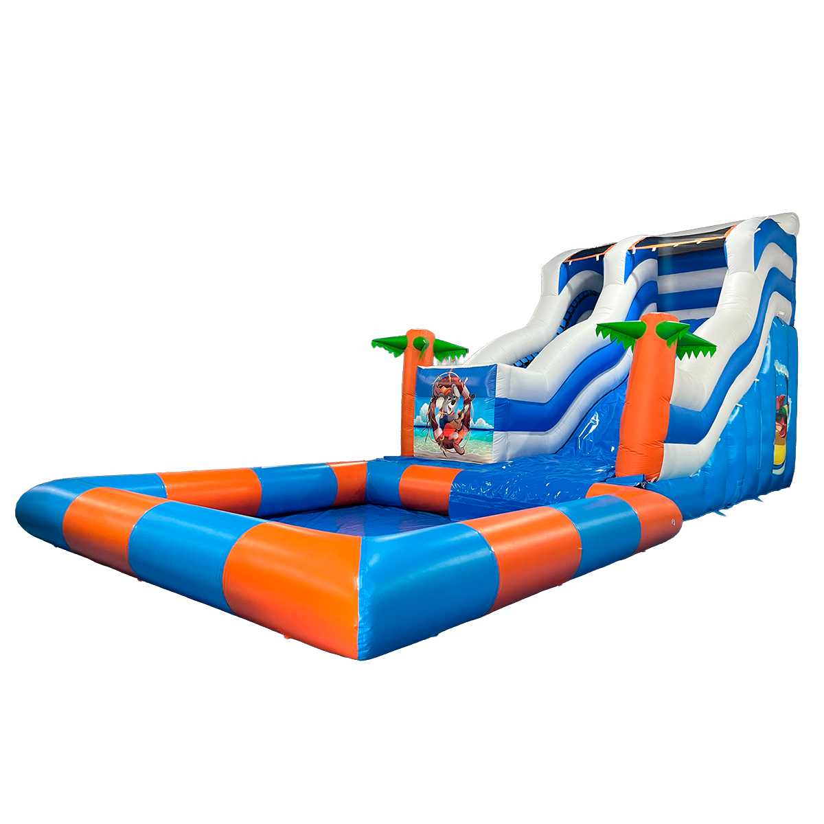 Коммерческий надувной батут с бассейном «Пляжный оазис 3» 13x5x6 — это уникальное сочетание водной горки, большого бассейна и красочного тропического дизайна с пальмами и морскими персонажами. Он создан для ярких эмоций, детского восторга и максимальной коммерческой отдачи. Благодаря своим размерам он привлекает внимание издалека и становится центром притяжения на любых мероприятиях: от городских праздников до частных вечеринок.