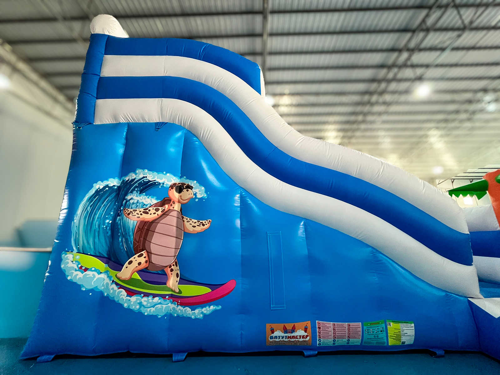 Аттракцион выполнен из непрозрачного усиленного армированного ПВХ плотностью 690–1100 г/м² и толщиной 0,55–0,9 мм. Такой материал успешно переносит многократные циклы надува-сдува, активную эксплуатацию и контакты с водой и солнцем, сохраняя яркую палитру жёлто-голубо-белых тонов. Сезон эксплуатации широкий: от 0 до +65 °C, что позволяет стартовать уже ранней весной и закрывать сезон поздним летом. Морская стилистика — пальмы, волны и герои — моментально создает тематическую атмосферу и фотопоинт, повышая органические охваты в соцсетях.