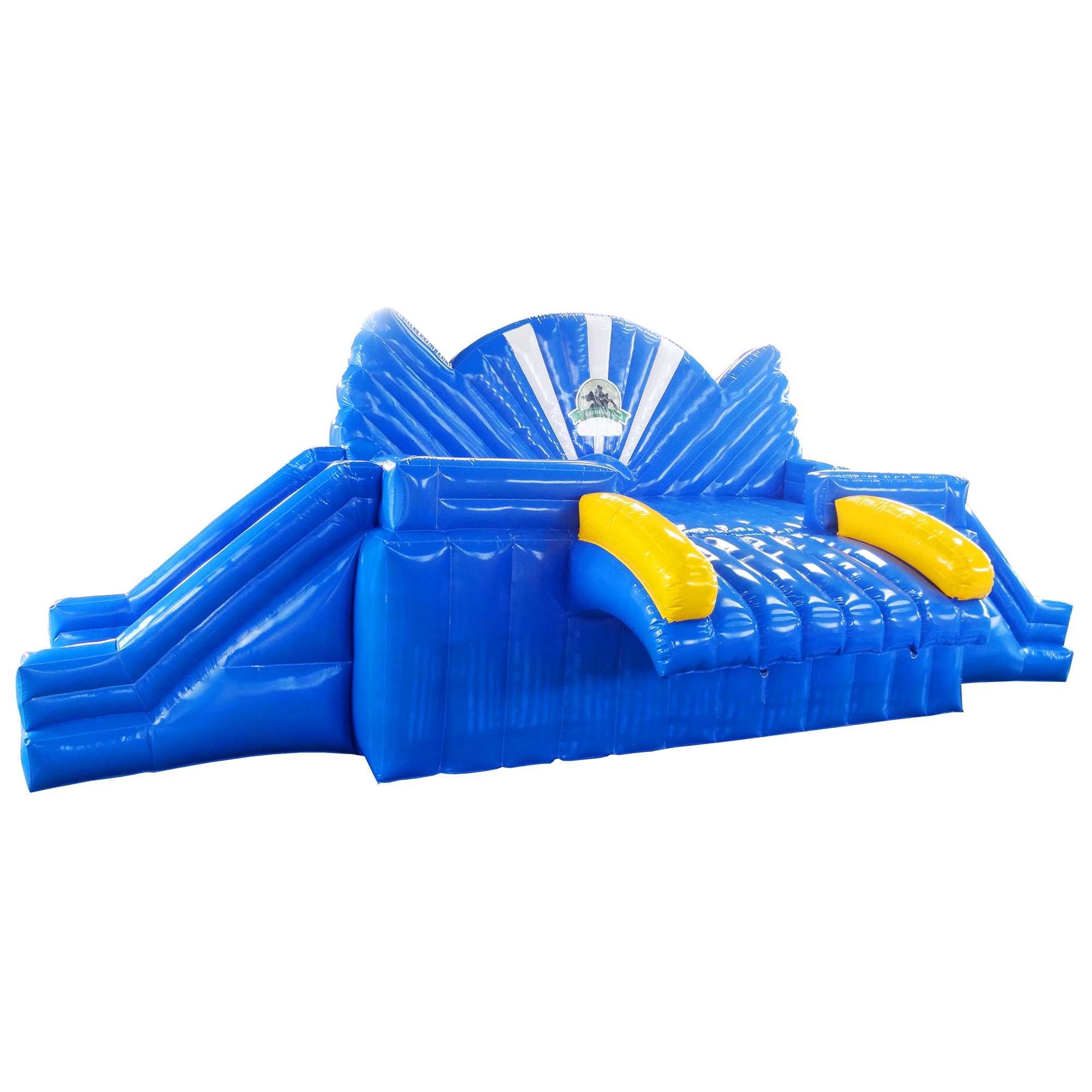 Рабочий сценарий прост: посетители поднимаются на верхнюю часть трамплина, плавно выходят на старт и выполняют прыжок в воду. Начальная высота ската — около 2 метров — даёт яркие, но контролируемые ощущения, подходящие широкой аудитории. Геометрия — один скат без «волн» для предсказуемой траектории. Встроенные борта удерживают пользователей на траектории, а мягкая поверхность из армированного непрозрачного ПВХ прощает неточные движения. Материал рассчитан на интенсивную эксплуатацию: плотность 690–1100 г/м² и толщина 0,55–0,9 мм обеспечивают баланс износостойкости и эластичности. Поверхность легко моется и выдерживает сезонную работу при температуре от 0 до +65 °C.