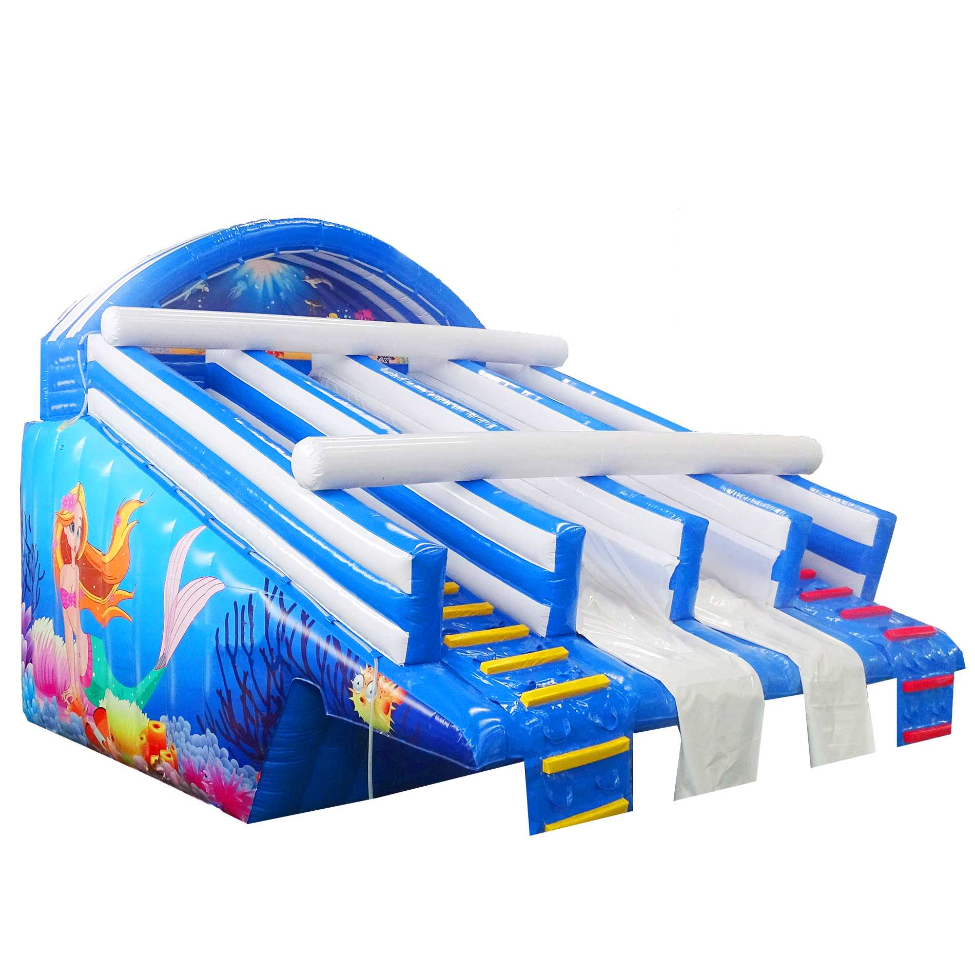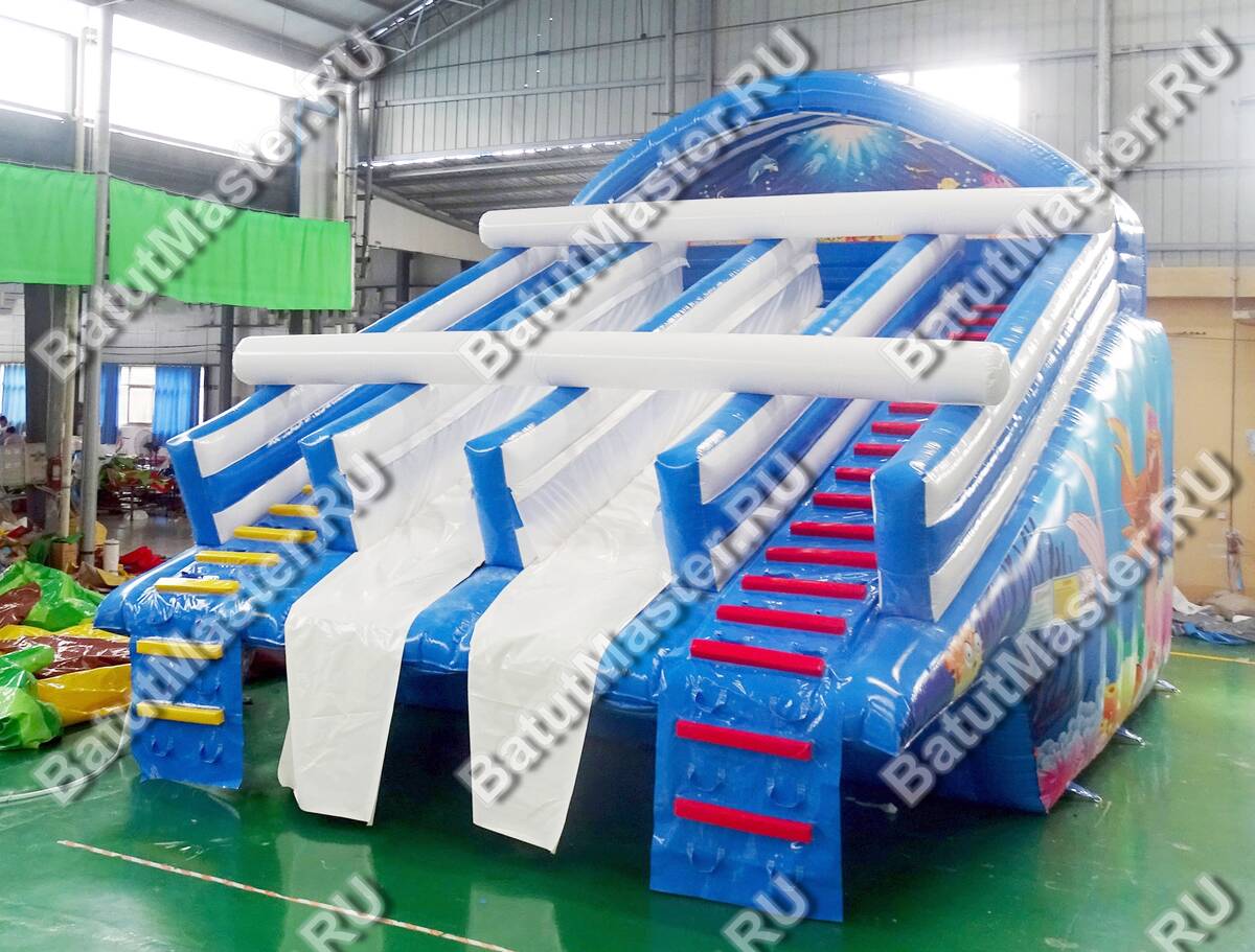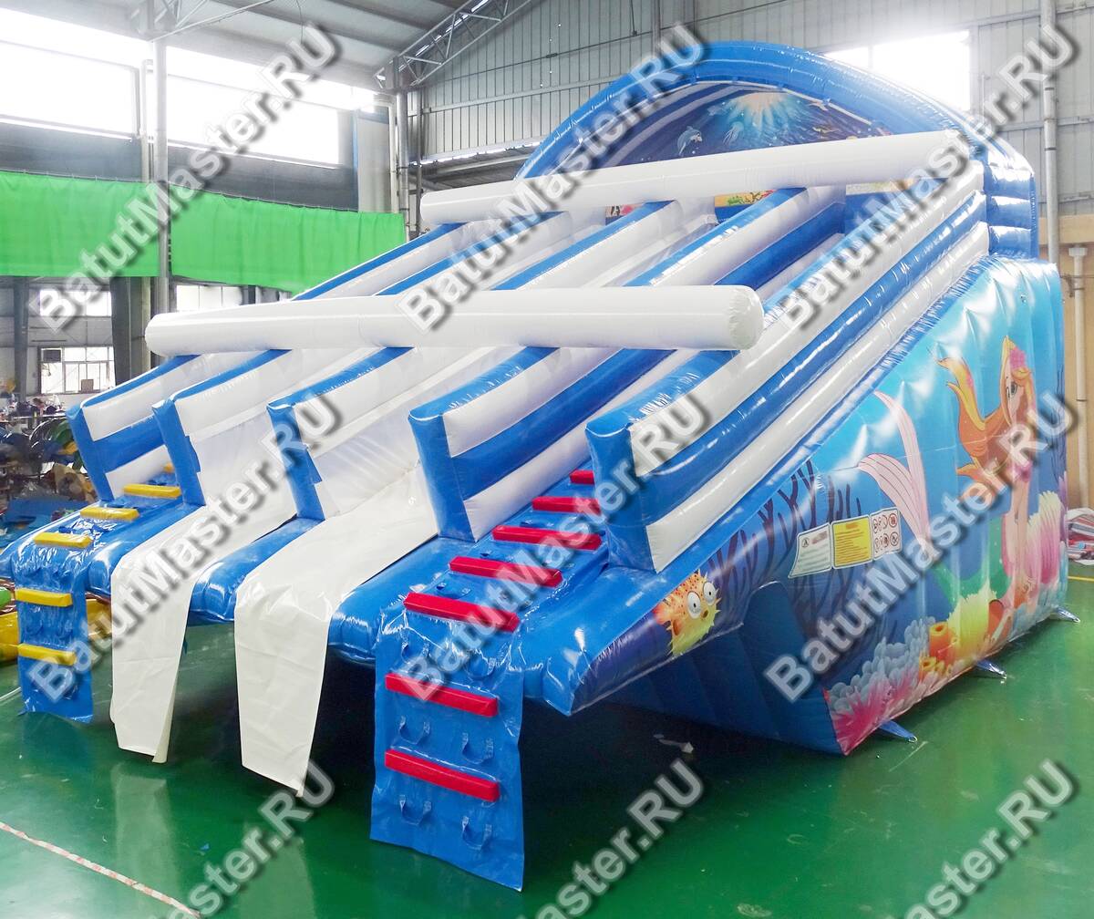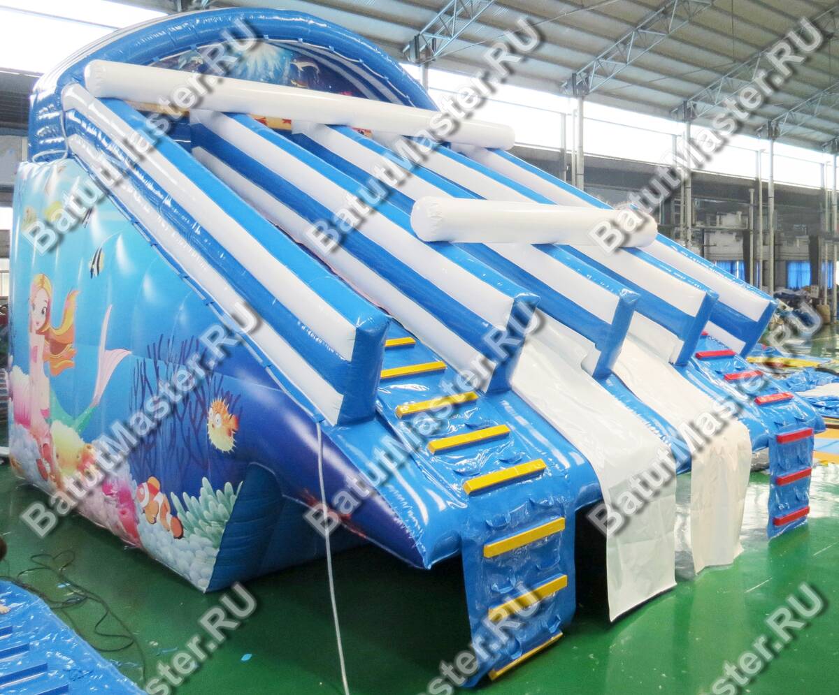 Материал корпуса — усиленный армированный непрозрачный ПВХ промышленного класса с толщиной 0,55–0,90 мм и плотностью 690–1100 г/м². Он устойчив к истиранию, ультрафиолету и перепадам температуры от 0 до 65 °С, что особенно важно для сезонной эксплуатации под открытым небом. Усиленные швы и износостойкие дорожки на лестничных маршах рассчитаны на многократные циклы катания. Цветовое решение в морской гамме подчёркивает концепцию «Русалочки», хорошо смотрится на фоне воды и летних фотозон, а при необходимости можно адаптировать оттенки под корпоративную айдентику: допускается индивидуальная окраска, масштабирование габаритов и полное брендирование фасадов под партнёров или спонсоров мероприятия.