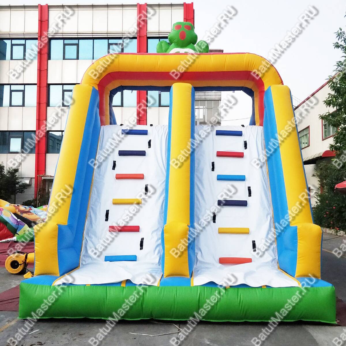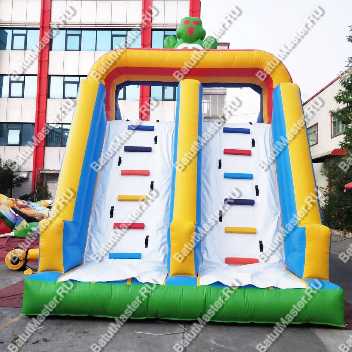 Материалы и швы рассчитаны на интенсивный поток: усиленная армированная ПВХ-ткань плотностью 690–1100 г/м² работает в диапазоне температур от 0 до 65 °C и стойко переносит абразивные нагрузки городских площадок. Толщина 0,55–0,9 мм обеспечивает баланс между лёгкой транспортировкой и ресурсом на сезон. Ключевые элементы — скат и лестница — выполнены сменными, фиксируются лентой «велкро»: в межсменный регламент оператор может быстро снять деталь для осмотра или профилактики и вернуть аттракцион в строй без долгого простоя.