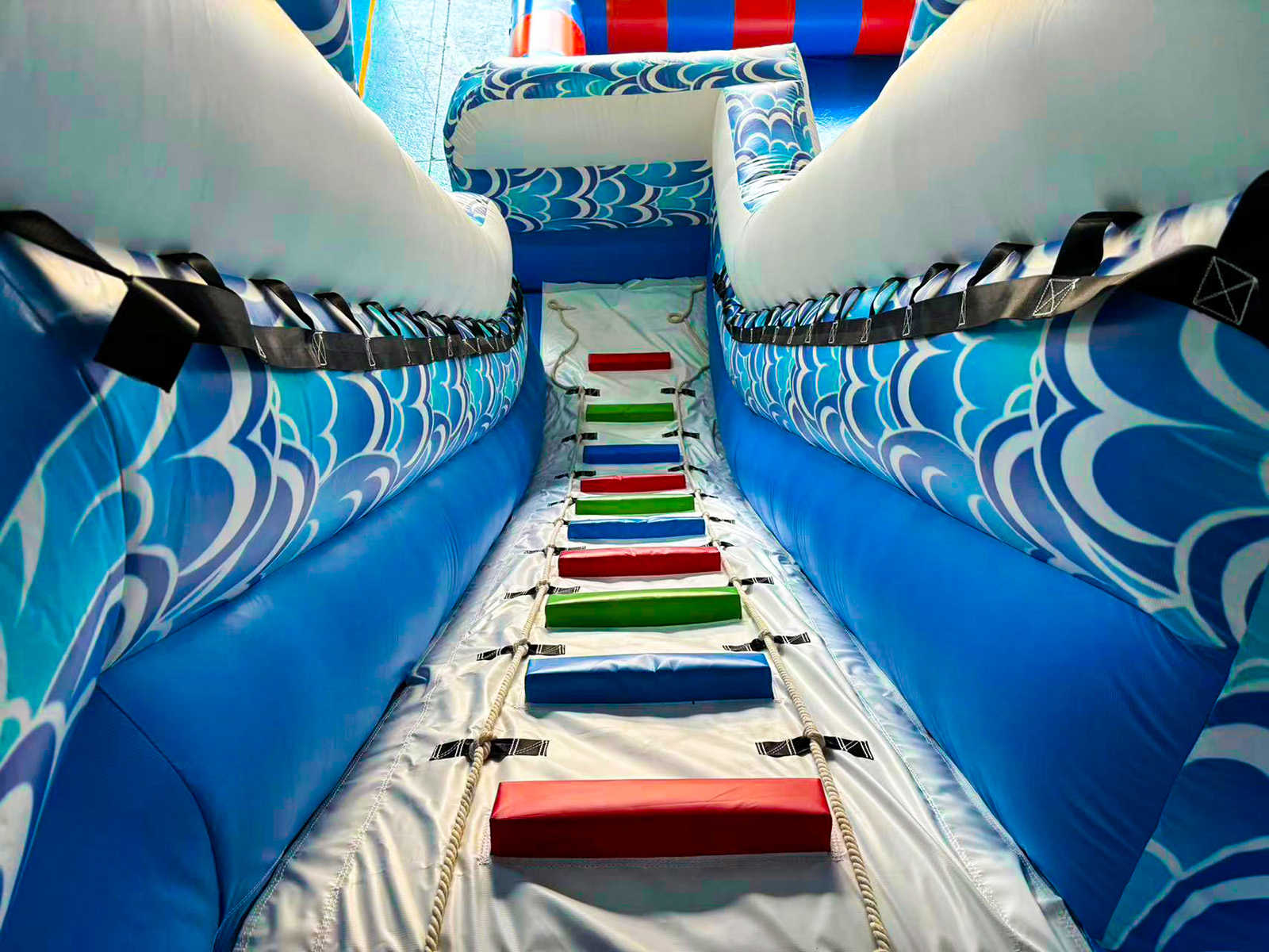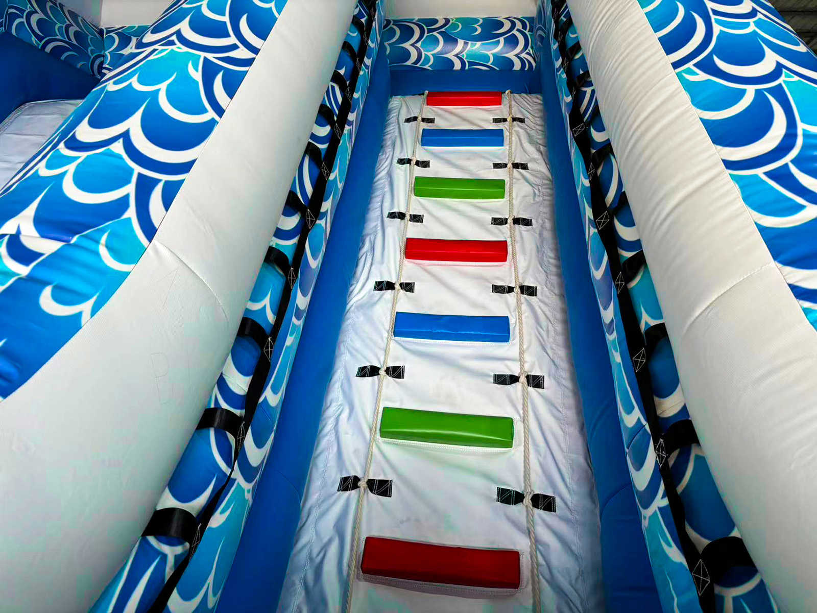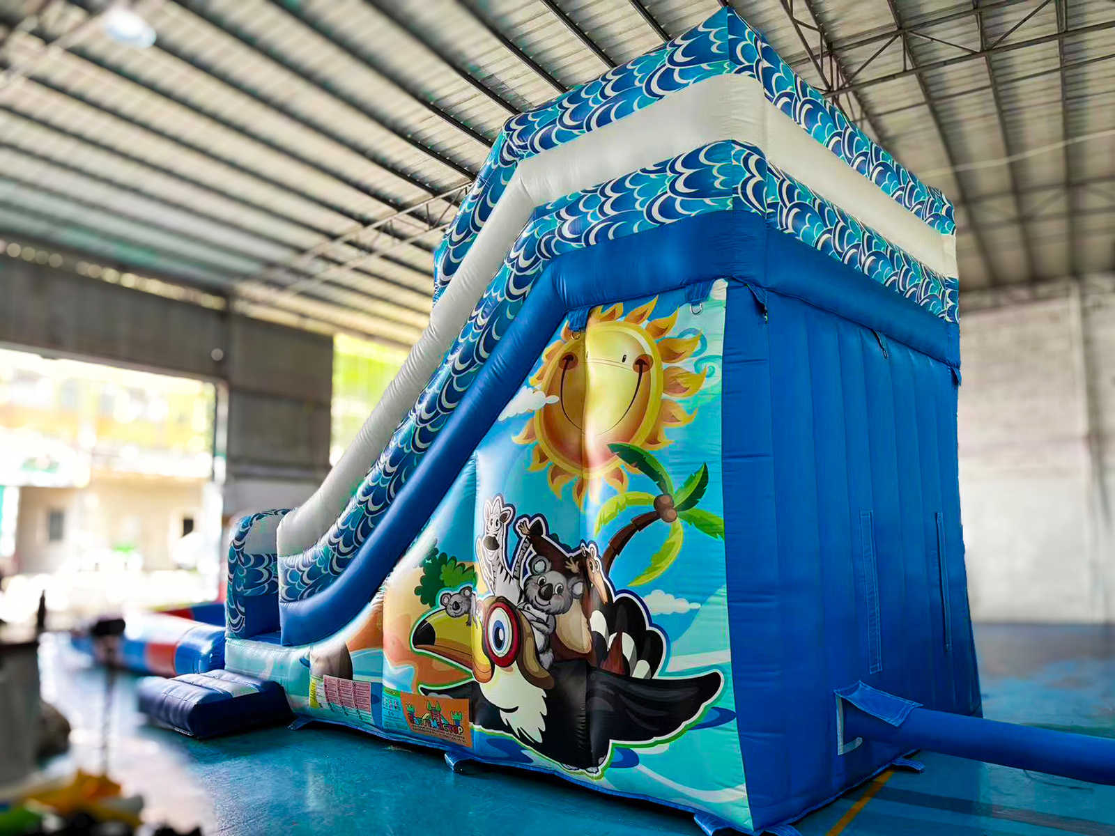 В основе — усиленный армированный ПВХ толщиной порядка 0,55–0,9 мм (плотность до 690–1100 г/м²), устойчивый к ультрафиолету и истиранию. Материал не просвечивает, сохраняет сочные фирменные цвета — синий, оранжевый, голубой и белый — и отлично держит форму на постоянном поддуве. Воздушная система поддерживает рабочее давление непрерывно, поэтому батут и горка всегда упругие, а уплотненные швы и заведомо надежные крепежные узлы держат статическую и динамическую нагрузку при одновременном пребывании до десяти детей.