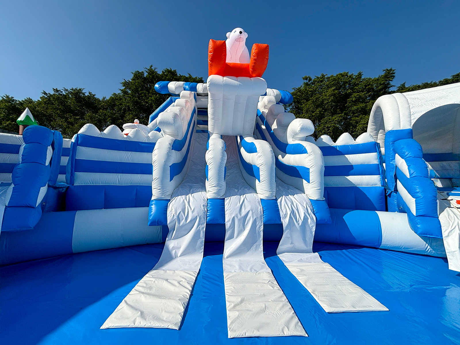 «Морское царство 3» — это наземный надувной аквапарк, который создаёт вокруг себя атмосферу курорта и зимней сказки одновременно: морская палитра из синего, голубого и белого оттенков сочетается с образами арктических животных, а центральная фигура пингвина становится естественной фотозоной и магнитом для гостей. Габариты комплекса 21x20x6 позволяют работать как на открытых пространствах, так и на урбан-площадках. Конфигурация рассчитана на интенсивный поток: пять параллельных скатов разной траектории формируют динамичную «волну» эмоций, при этом стартовые площадки и подходы организованы так, чтобы разделять поток тех, кто поднимается, и тех, кто только завершил спуск. Широкий модуль с лестницами по фронту в 20 м даёт комфортную посадку и высокую пропускную способность без узких мест, что особенно важно в пиковые часы.