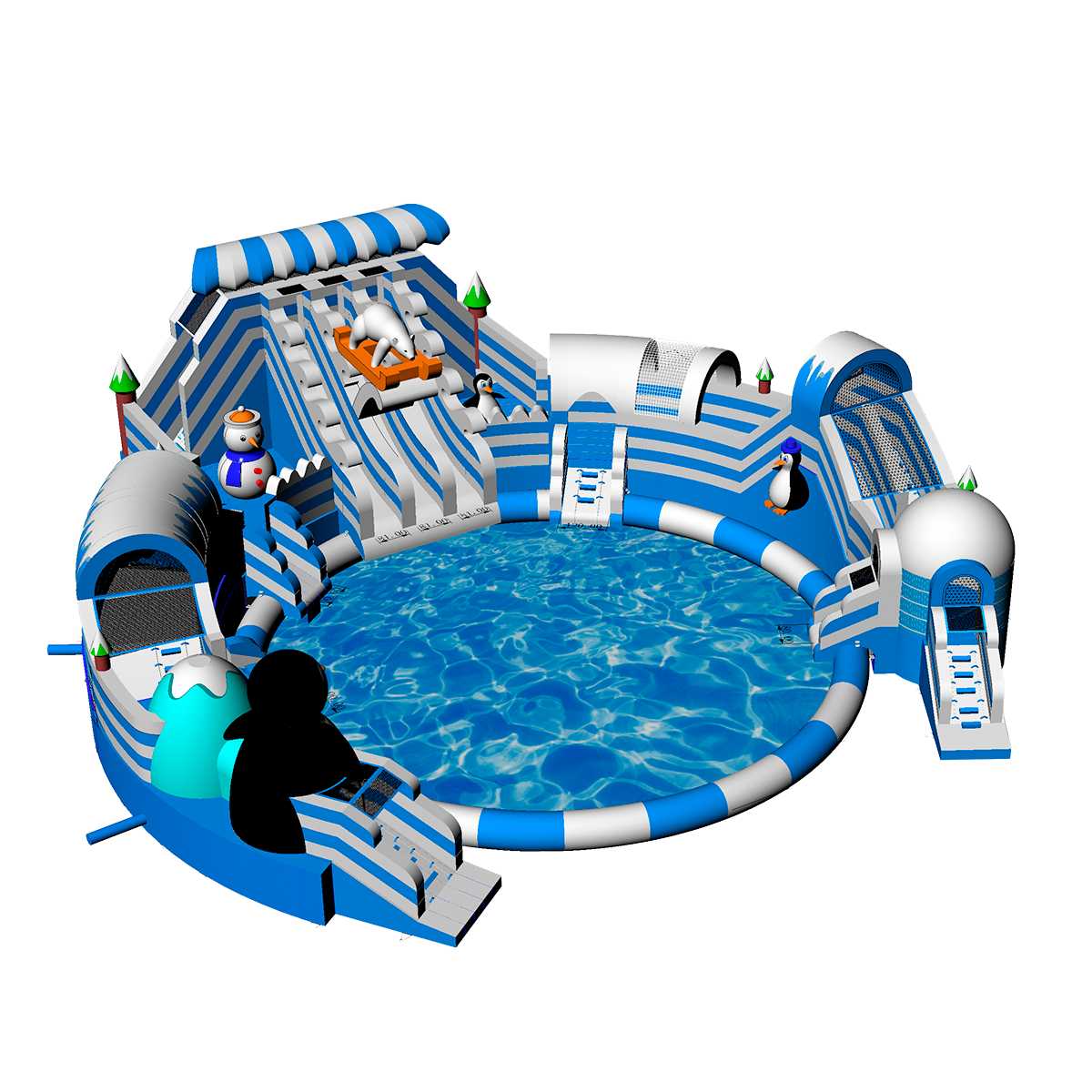 Аквапарк разработан как коммерческое оборудование для интенсивной ежедневной эксплуатации. Конструкция выполнена из усиленного армированного ПВХ (непрозрачная ткань толщиной 0,55–0,9 мм и плотностью 690–1100 г/м²), устойчива к ультрафиолету и перепадам температур от 0 до +65 °C, а цветовое решение в оттенках синего, голубого и белого поддерживает тему моря и «полярного приключения». Тип опоры — «батуты на постоянном поддуве»: воздух подаётся непрерывно, что гарантирует упругость оболочек, мягкие посадки и дополнительную безопасность на старте и финише. При рабочем режиме комплекс стабильно держит форму, а система клапанов сбрасывает избыточное давление, предотвращая перекачку.