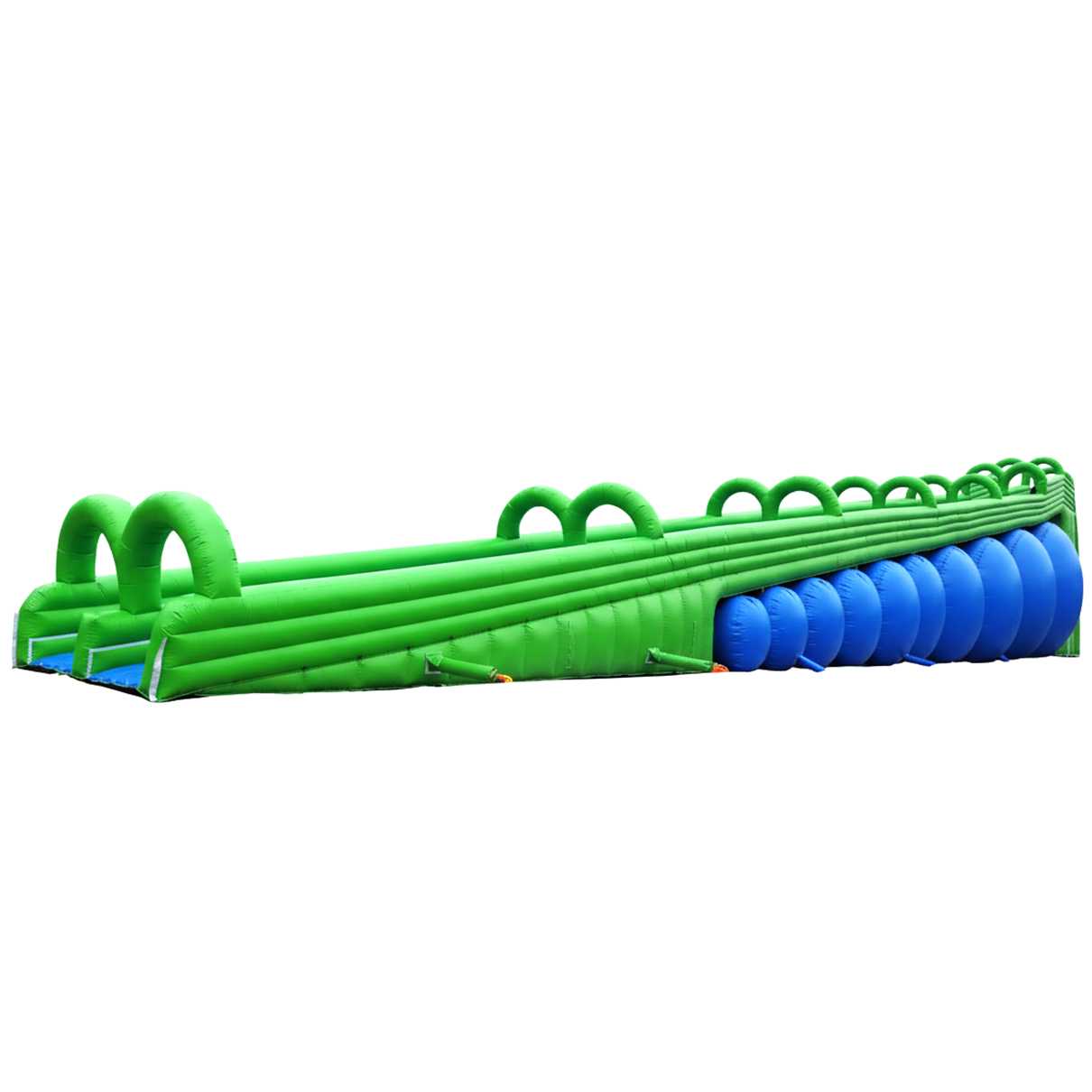 Конструкция выполнена из усиленного армированного непрозрачного ПВХ промышленного класса с толщиной полотен в диапазоне 0,55–0,9 мм и плотностью 690–1100 г/м². Такой материал стойко переносит активную нагрузку, ультрафиолет и перепады температур от 0 до 65 °C, сохраняет яркость фирменных цветов (зелёный и голубой) и форму в течение длительного сезона. В качестве опоры используются батутные камеры на постоянном поддуве: вентилятор поддерживает внутри устойчивое избыточное давление, благодаря чему все объёмные элементы остаются упругими, лестницы — комфортными, а ограждающие борта — безопасными на всей траектории движения. Постоянный поддув дополнительно повышает живучесть комплекса: в случае локального прокола воздух компенсируется, а оператор получает время для регламентного обслуживания.