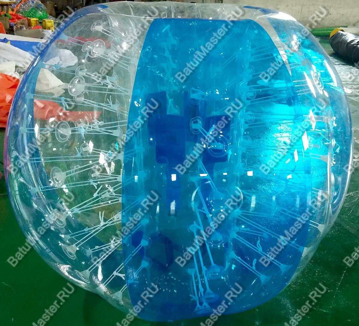 Бампербол — это прочный надувной шар, который игроки надевают на себя, оставляя ноги свободными. Внутри шара находятся ручки и ремни безопасности, фиксирующие человека и позволяющие ему уверенно двигаться. В таком снаряжении можно бегать, прыгать, сталкиваться с другими участниками, переворачиваться и даже кувыркаться без риска получения серьезных травм.