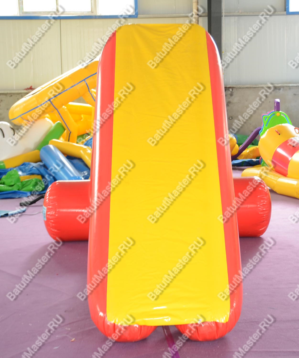 Материал модуля — армированный ПВХ толщиной 0,9 мм, предназначенный для активной эксплуатации. Он устойчив к порезам, ультрафиолету и температурным перепадам. Все швы выполнены методом сварки внахлёст с шириной 2,5 см — что гарантирует герметичность и надёжность конструкции. Ручки для подъёма и взаимодействия выполнены из прочного материала и надёжно закреплены, что исключает соскальзывание. Минимальная глубина воды для безопасного использования — от 1,9 м. Это делает модуль пригодным для установки как в стационарных бассейнах, так и в открытых водоёмах с контролируемой глубиной.