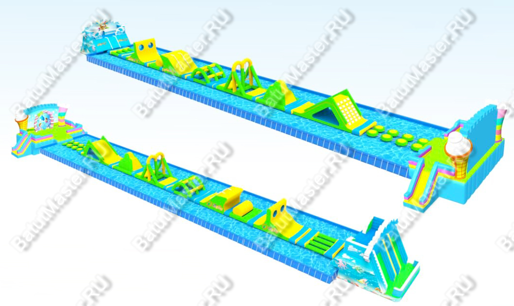 Это уникальное сооружение водных аттракционов, состоящее из нескольких модулей. Надувные модули собираются в любой последовательности, создавая персональный водный комплекс.