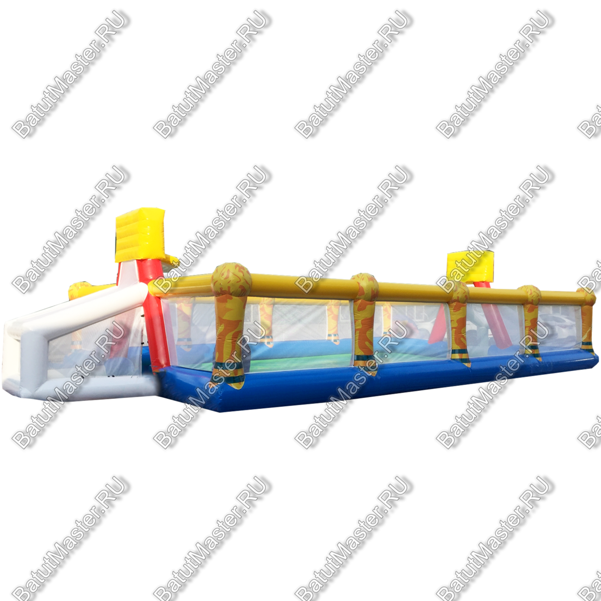 Коммерческое спортивное поле для бизнеса – это полезная, универсальная конструкция, при этом мягкая и воздушная. Она необходима для выполнения различных трюков, тренировок, а также подвижных игр в мяч и т.д. Основа площадки – это своего рода батут, который является, как и вся конструкция, надувным. Стоит отметить, что площадка имеет ворота, оснащенные сеткой. Причем прочная сетка тут размещена по всему периметру. Так, на игровом поле будет лучше циркулировать воздух, игроки все время останутся на виду. Цветовая гамма напоминает мяч, все выдержано в спокойных тонах.