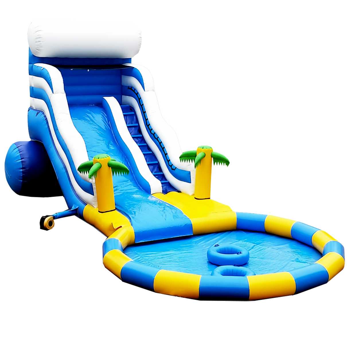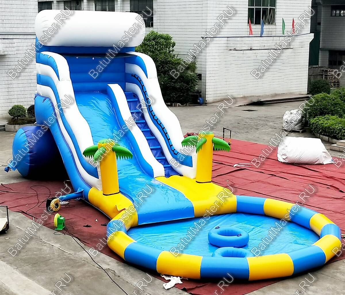 «Пляжный оазис» — надувной аква-аттракцион, объединяющий динамику водной горки и эмоциональную зону отдыха в круглом бассейне. Формат создан специально для бизнеса, который зарабатывает на летних аттракционах, фестивалях и семейных пространствах. Габариты комплекса 15×7×6 м позволяют работать как самостоятельной точке притяжения в парке или на пляже, так и усилителем инфраструктуры действующего аквапарка или сезонной площадки у ТРЦ. С первого взгляда объект выделяется сочной морской палитрой с оттенками синего, голубого и жёлтого, а графика с пальмами подчёркивает курортный характер зоны — то, что инстинктивно ищут посетители в жаркий день.