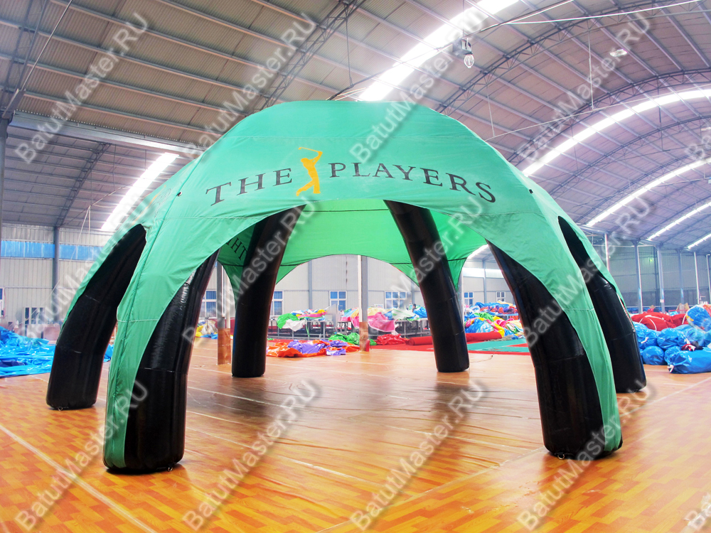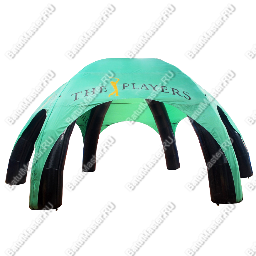 Такая проблема легко разрешима при помощи альтернативного подхода – тента из нейлона и ПВХ. Это сочетание материалов делает тент прочным, но в то же время не тяжелым. Основа шатра состоит из 6 надувных опор из ПВХ, поверх которых натянут нейлон. Расцветка представленной модели (черно-зеленая) более чем гармоничная и подходит к площадкам разного дизайна. Но, если вы решите изменить цветовую палитру тента, мы с удовольствием изготовим такой же точно шатер, но в предложенных вами тонах. Каждая надувная опора тента из ПВХ обеспечена системой крепления, которая надежно крепит тент к любой горизонтальной поверхности.