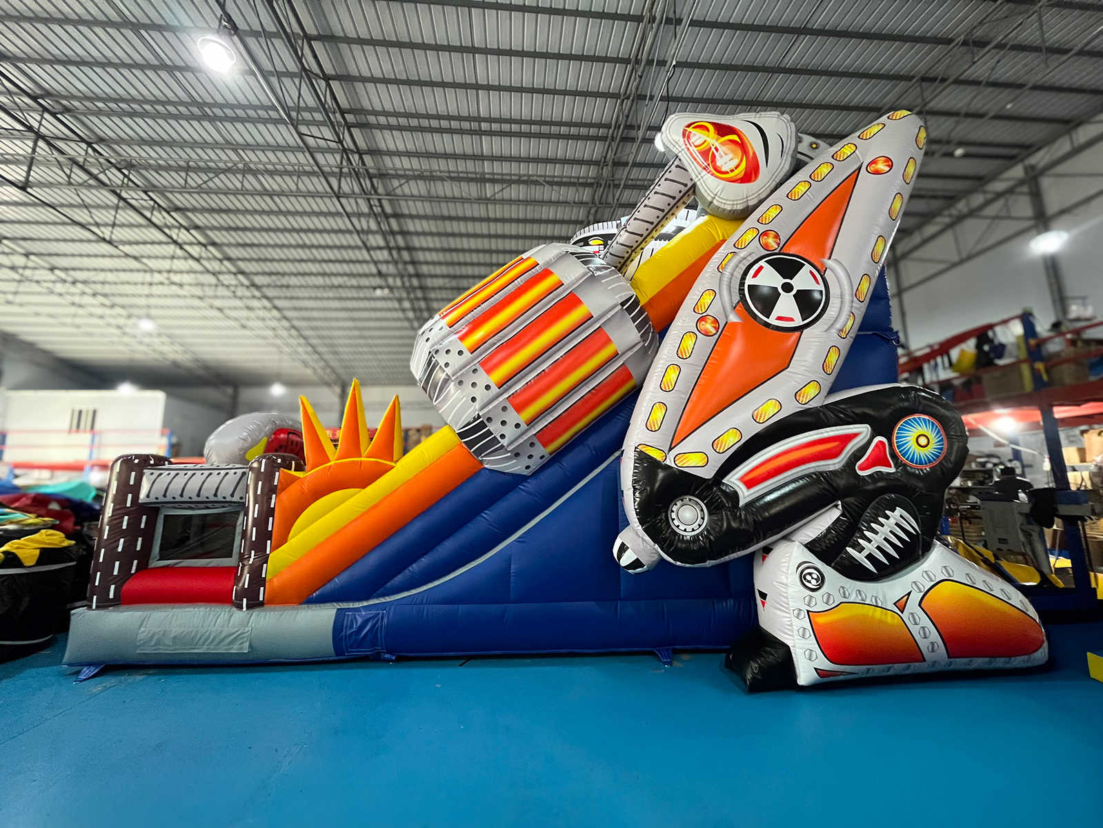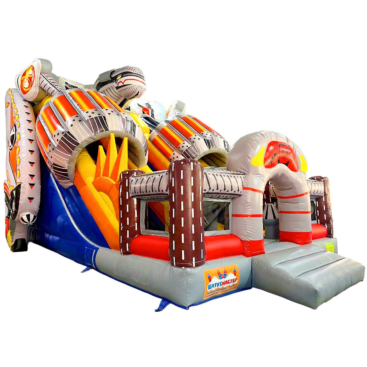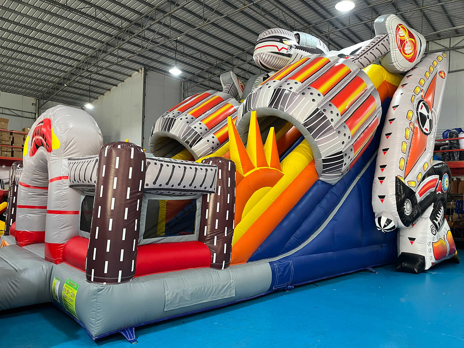 Коммерческий надувной батут с двумя горками «Робот» 8x6x6.5 м — это уникальная игровая конструкция, созданная в стилистике высокотехнологичных роботов и механизированных миров. Как только ребёнок переступает входную арку, он оказывается в атмосфере фантастической вселенной, где гигантские двигатели, стилизованные трубы, декоративные металлические элементы и яркие цветовые акценты создают настроение настоящего приключения.