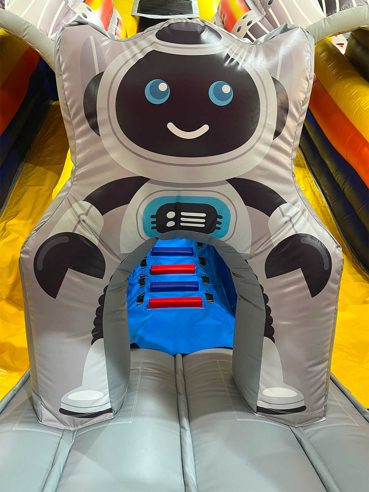 Эффектная визуальная концепция привлекает внимание издалека: массивные элементы «робо-головы» наверху горок, яркие блоки, стилизованные под механизмы, и динамичная композиция цветов превращают батут в магнит для детей и родителей. Благодаря своим размерам он отлично заметен в торговых павильонах, на уличных площадках, в кафе, возле автомоек, на ярмарках, выставках и шоурумах.