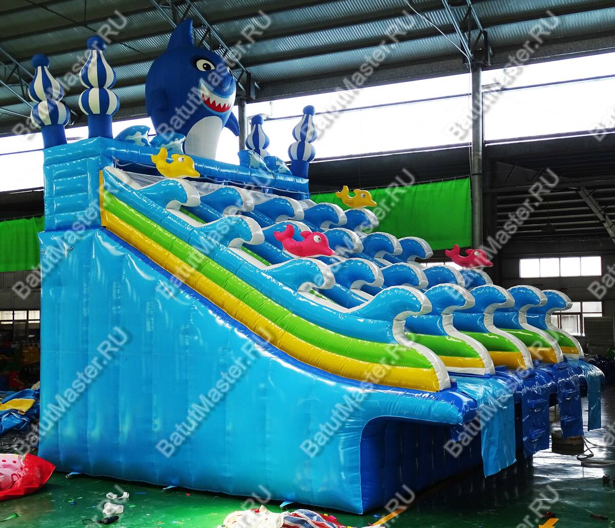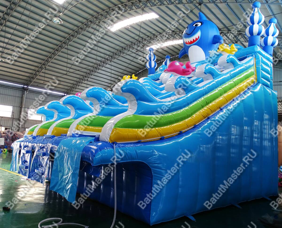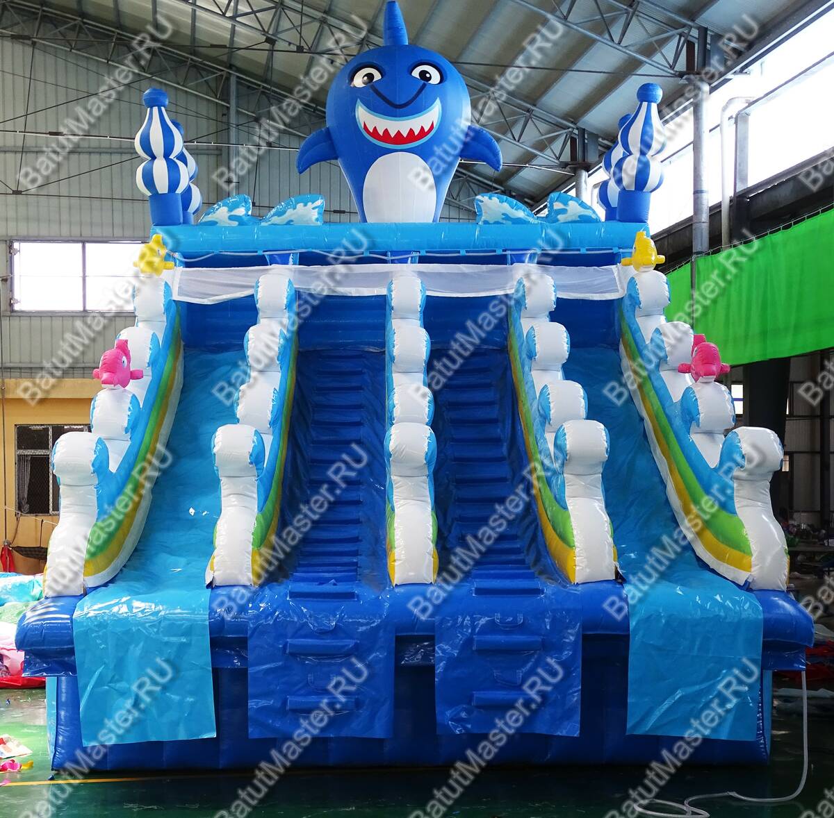 Надувная водная горка «Акулёнок» – это не просто аттракцион, а целый морской мир, который с первых секунд привлекает внимание детей и взрослых. Огромная фигура улыбающегося акулёнка, волны, яркие морские обитатели создают атмосферу летнего праздника. Благодаря своим размерам (8x6x8 м) горка видна издалека и становится центром притяжения на любой площадке.