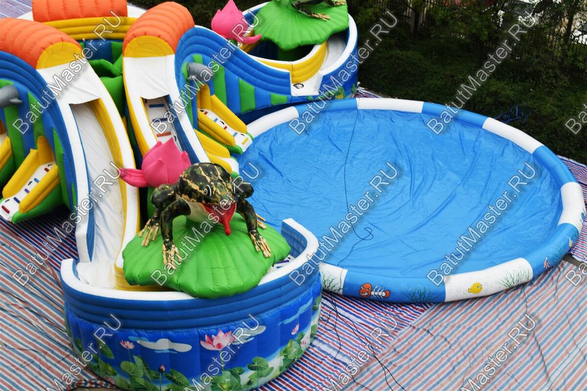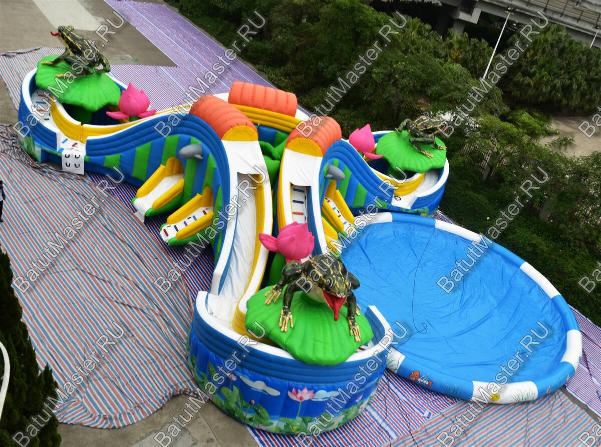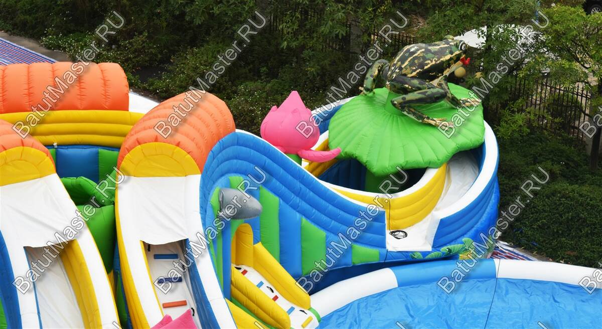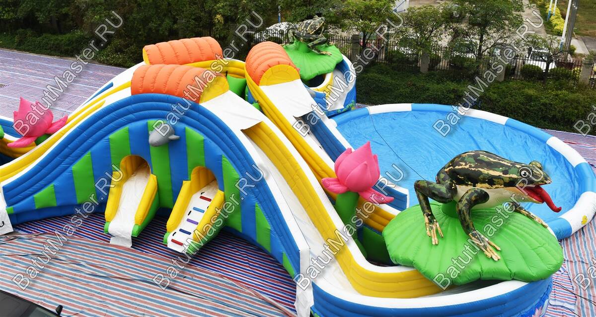 «Пруд с лотосами» — это наземный надувной аквапарк формата 25×25×5 м, созданный как готовый коммерческий аттракцион для пляжей, семейных парков, курортных отелей, городских праздников и торгово-развлекательных центров с летними зонами. В основе сценария — яркая природная тема: цветы, лягушка-талисман и мягкая палитра синего, белого, розового, голубого, оранжевого и зелёного оттенков, которая сразу выделяет площадку среди соседних развлечений и повышает конверсию прохожих в платных посетителей.