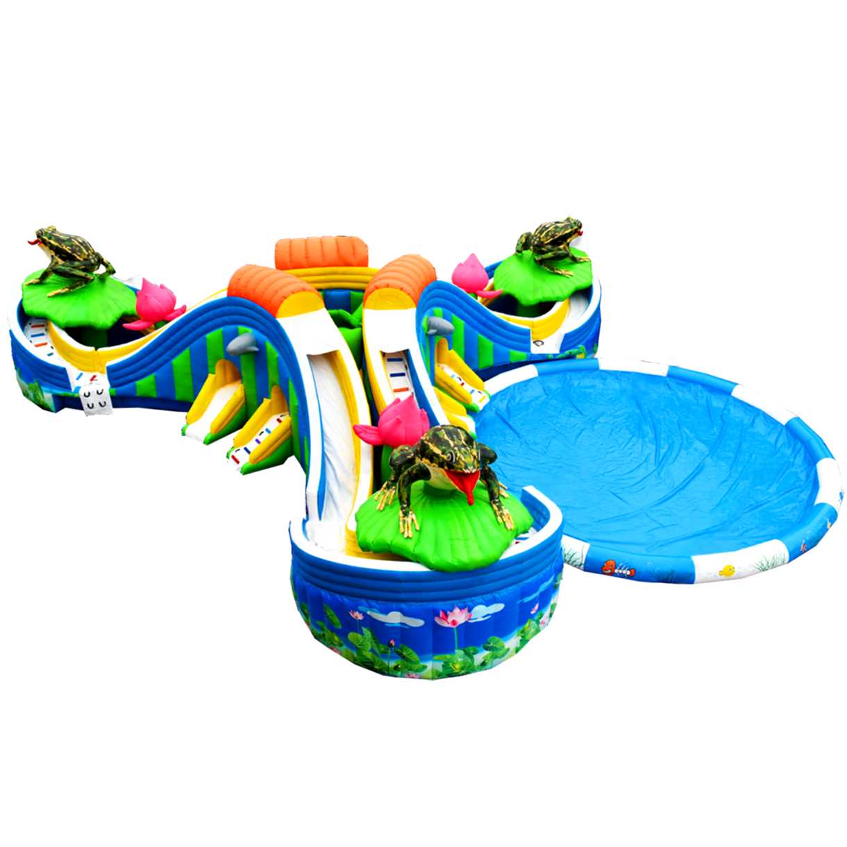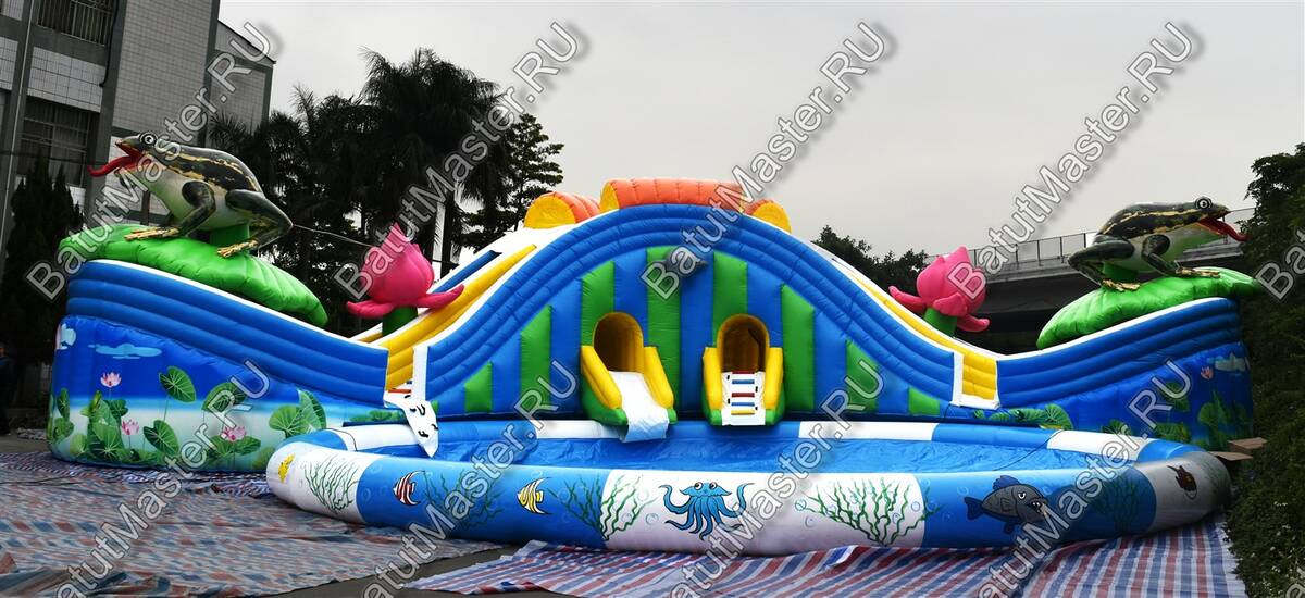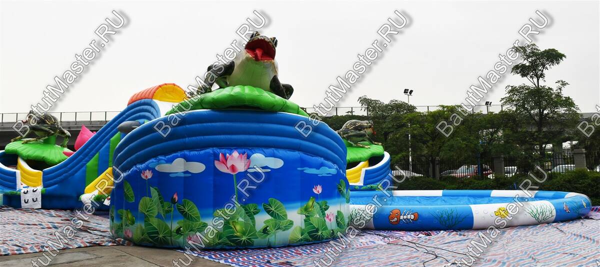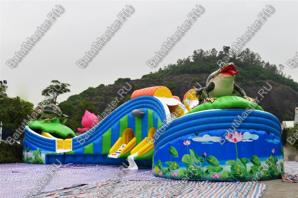 «Пруд с лотосами» — это наземный надувной аквапарк формата 25×25×5 м, созданный как готовый коммерческий аттракцион для пляжей, семейных парков, курортных отелей, городских праздников и торгово-развлекательных центров с летними зонами. В основе сценария — яркая природная тема: цветы, лягушка-талисман и мягкая палитра синего, белого, розового, голубого, оранжевого и зелёного оттенков, которая сразу выделяет площадку среди соседних развлечений и повышает конверсию прохожих в платных посетителей.