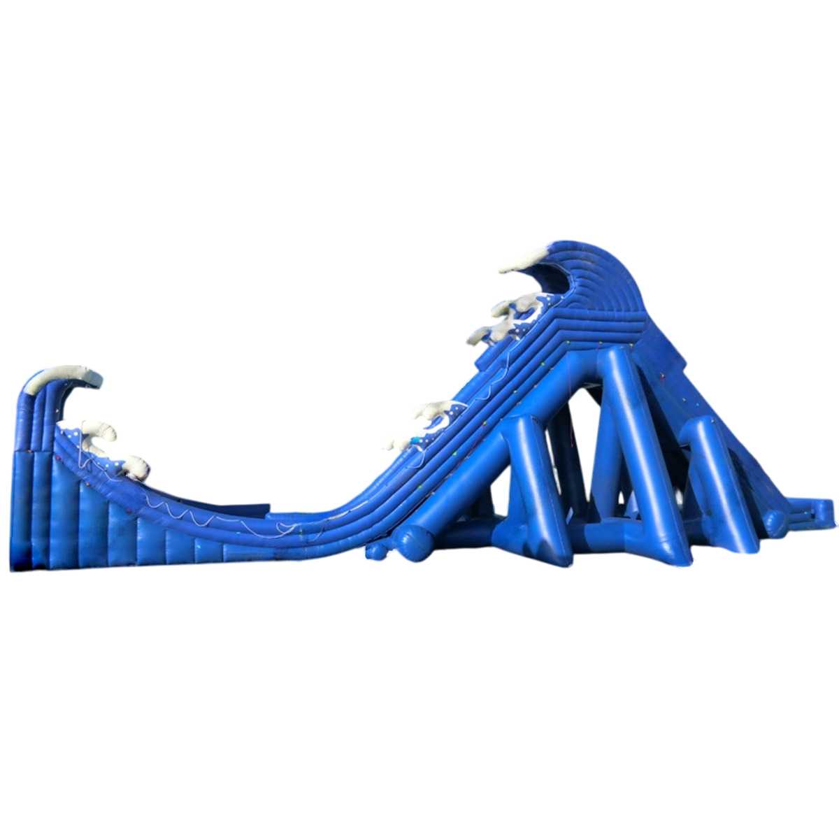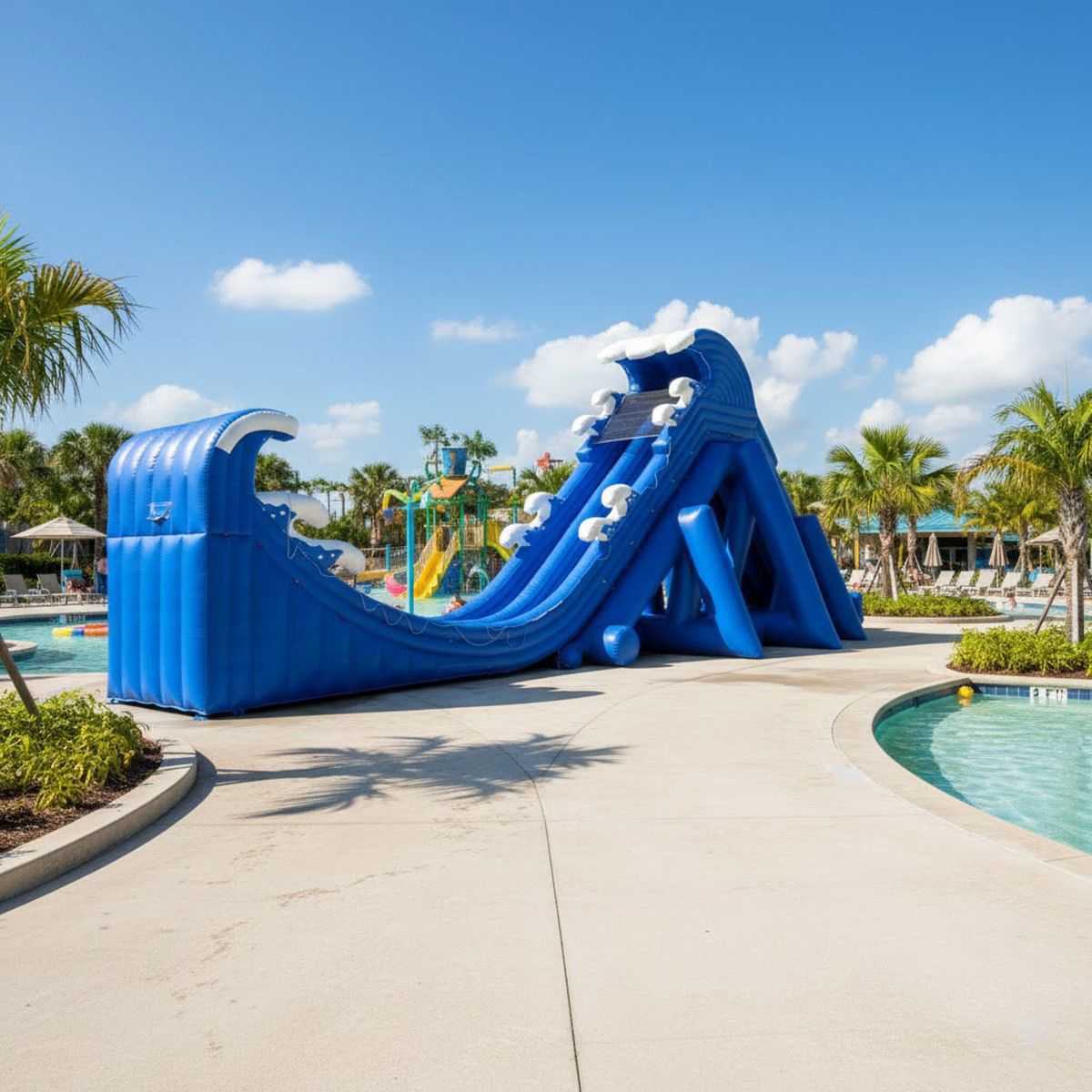 Дизайн горки выполнен в стиле морской волны, символизируя движение, свободу и летние приключения. Цветовая гамма — насыщенный синий с белыми акцентами — притягивает внимание детей и взрослых, создавая атмосферу настоящего морского курорта. Два широких спуска позволяют снизить очереди, повысить безопасность и динамику катания. После спуска посетители мягко приземляются в встроенный бассейн глубиной 0,65 м.