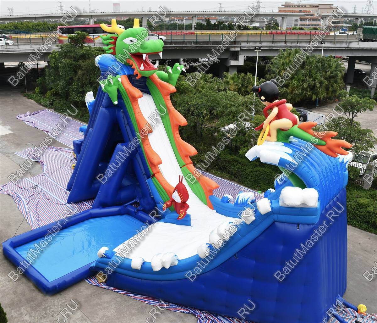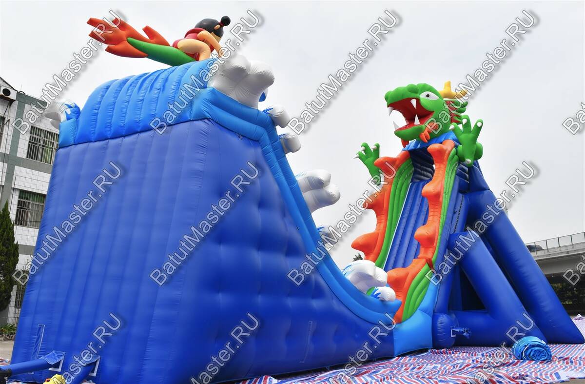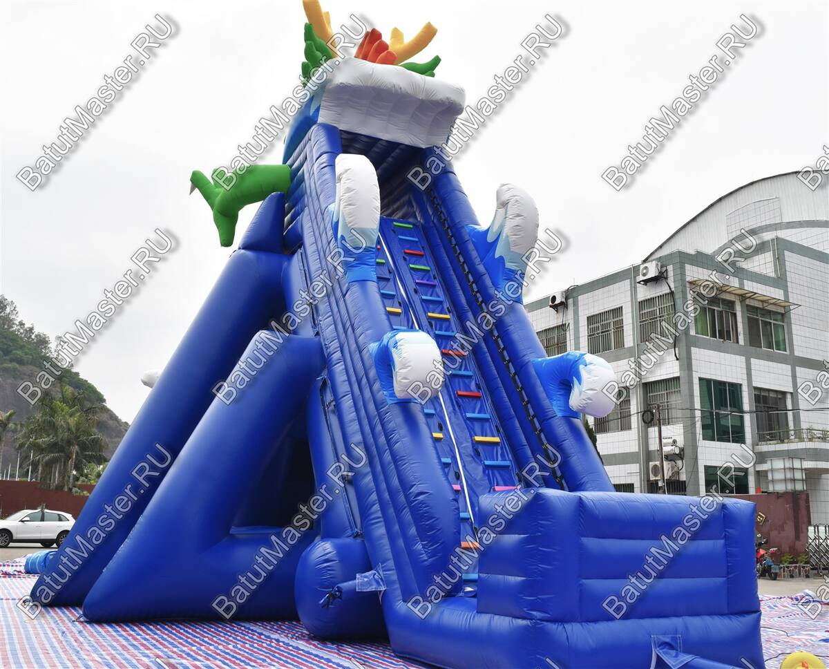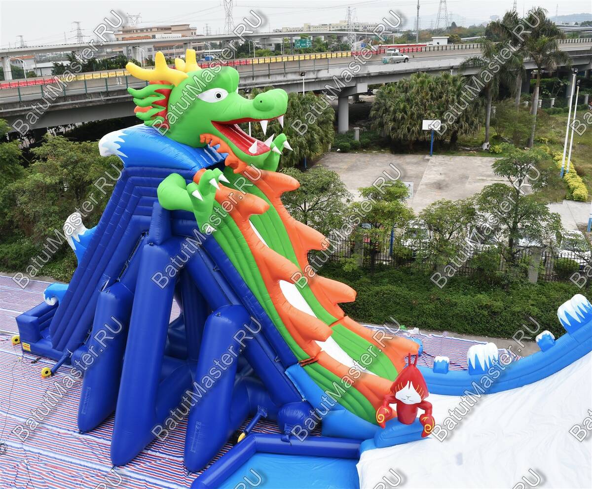 Монтаж и демонтаж логичны и быстры: на ровной площадке с минимальным уклоном персонал устанавливает полотно, раскладывает чашу, фиксирует точки крепления и подключает воздуходувы. Благодаря продуманной схеме размещения узлов крепления аттракцион стабильно держится на месте, а после завершения смены сворачивается без лишних усилий. Обслуживание сводится к ежедневному осмотру швов и крепёжных элементов, поддержанию чистоты поверхности и контролю подачи воды на скат. В базовой комплектации вы получаете всё необходимое для старта — надувную оболочку, насосы, чехол для хранения, ремонтный комплект с запасным материалом; при этом конструкция допускает кастомизацию: можно изменить размеры под параметры площадки, подобрать индивидуальные цветовые решения и нанести фирменное брендирование, превращая «Драконью гору» в полноценный рекламный медианоситель.