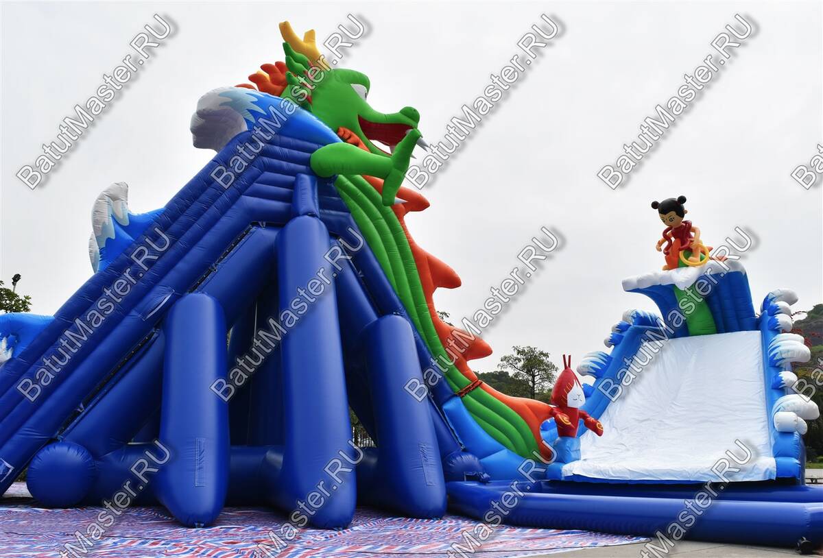 Надувной наземный аквапарк «Драконья гора» — флагманский семейный аттракцион, который приносит устойчивый трафик и доход на любых площадках: от городских пляжей и набережных до загородных курортов и семейных парков. Комплекс занимает пространство 27 на 17 метров при высоте 11 метров, за счет чего мгновенно заметен издалека и сам по себе работает как яркая рекламная доминанта. Дизайн в стилистике морских приключений с драконами отсылает к популярным детским сюжетам и моментально вовлекает аудиторию: дети стремятся покорить «горный хребет», родители с удовольствием наблюдают и фотографируют, а поток гостей стабильно растёт в течение дня.