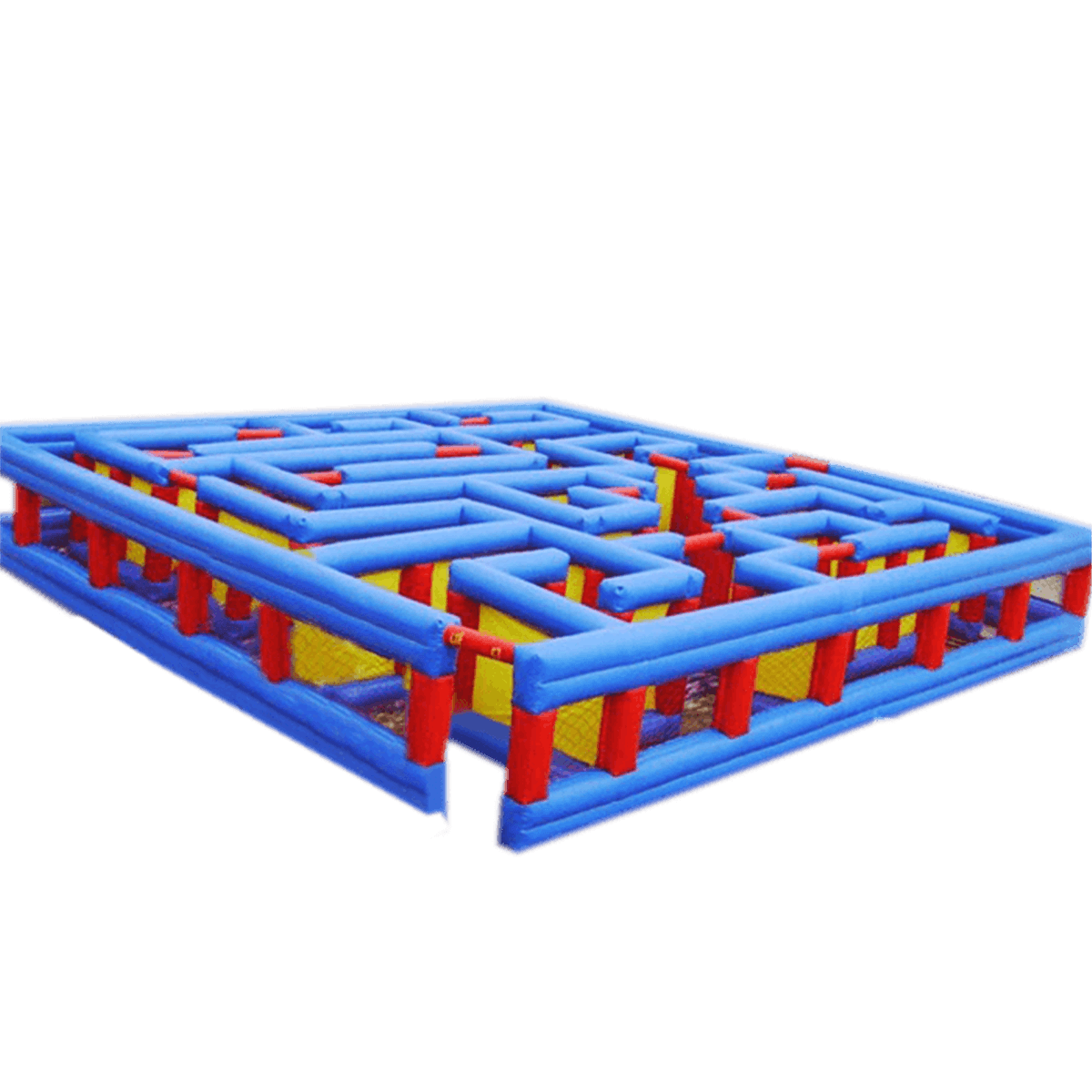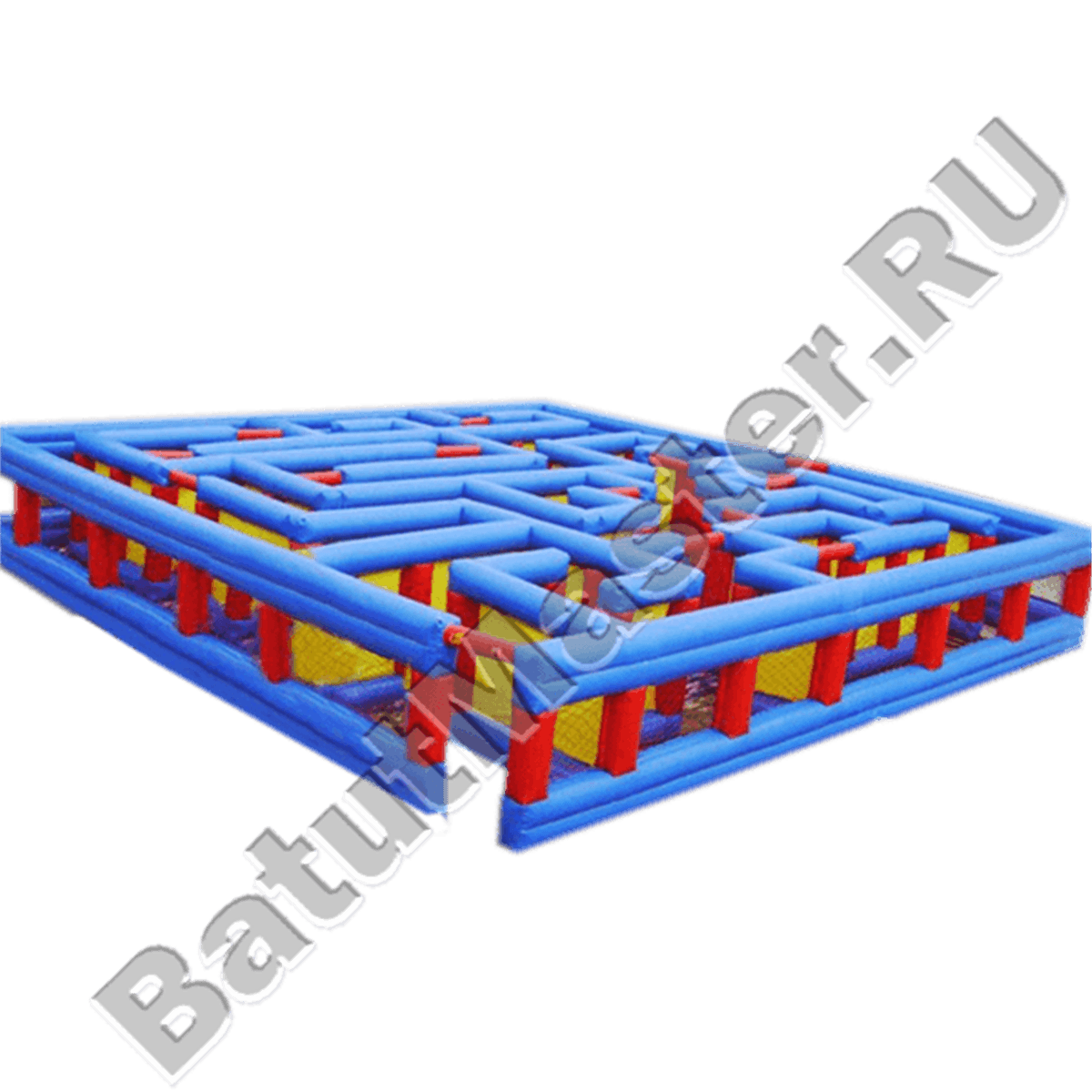 Коммерческий надувной батут «Лабиринт» выполнен из надувных столбов и перегородок синего, красного и желтого цвета. Вся плоскость игровой зоны разделена на дорожки и преграды, внешние стороны надувного лабиринта обтянуты плотной полупрозрачной сеткой, чтобы детки, заблудившись внутри, не испугались.