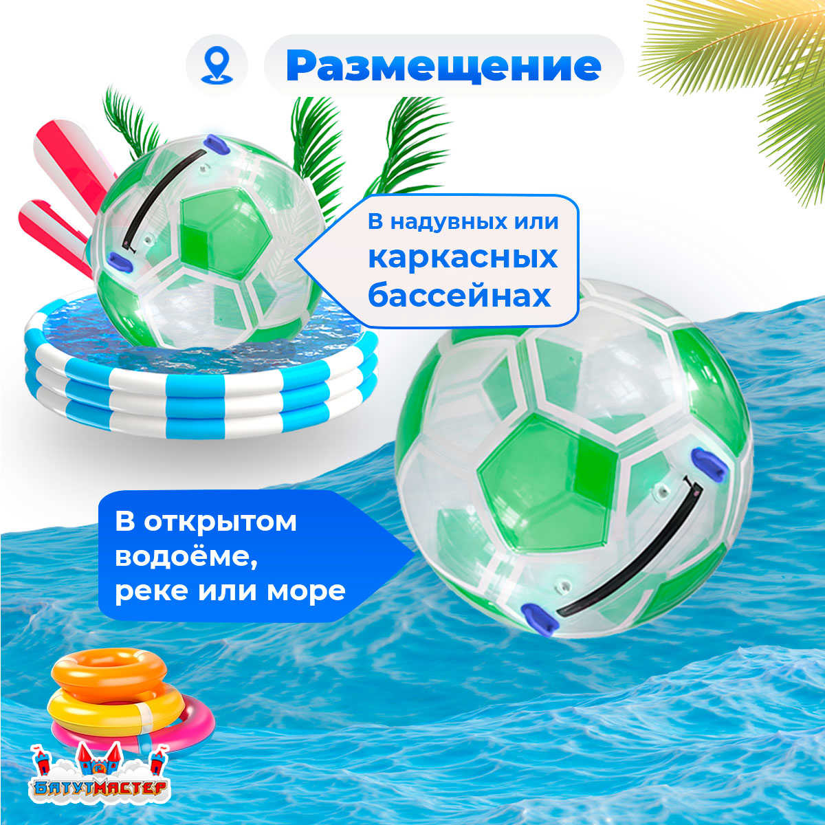 Вы можете использовать водный шар в самых разных местах. Главное условие — вода глубиной от 0,5 до 1 метра.