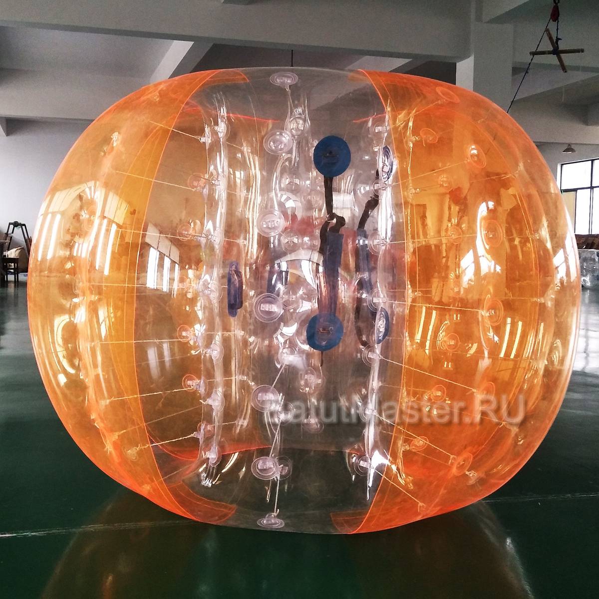 Бампербол — это прочный надувной шар, который игроки надевают на себя, оставляя ноги свободными. Внутри шара находятся ручки и ремни безопасности, фиксирующие человека и позволяющие ему уверенно двигаться. В таком снаряжении можно бегать, прыгать, сталкиваться с другими участниками, переворачиваться и даже кувыркаться без риска получения серьезных травм.