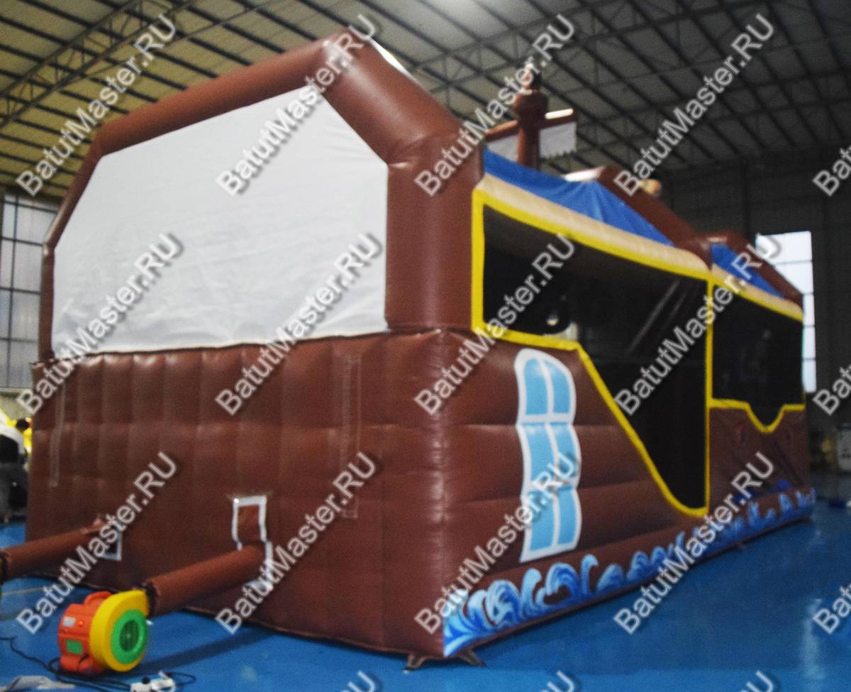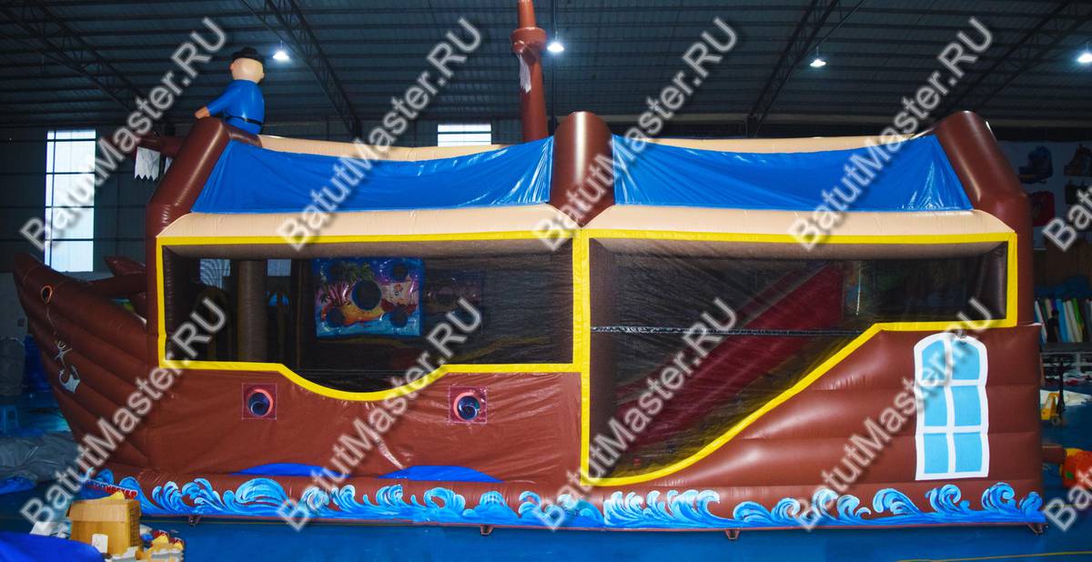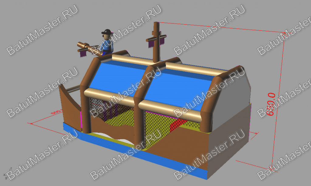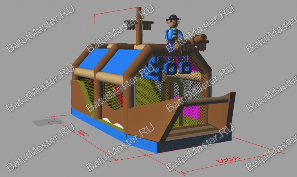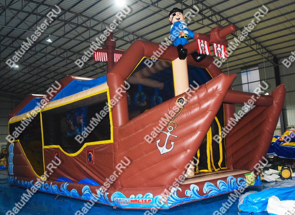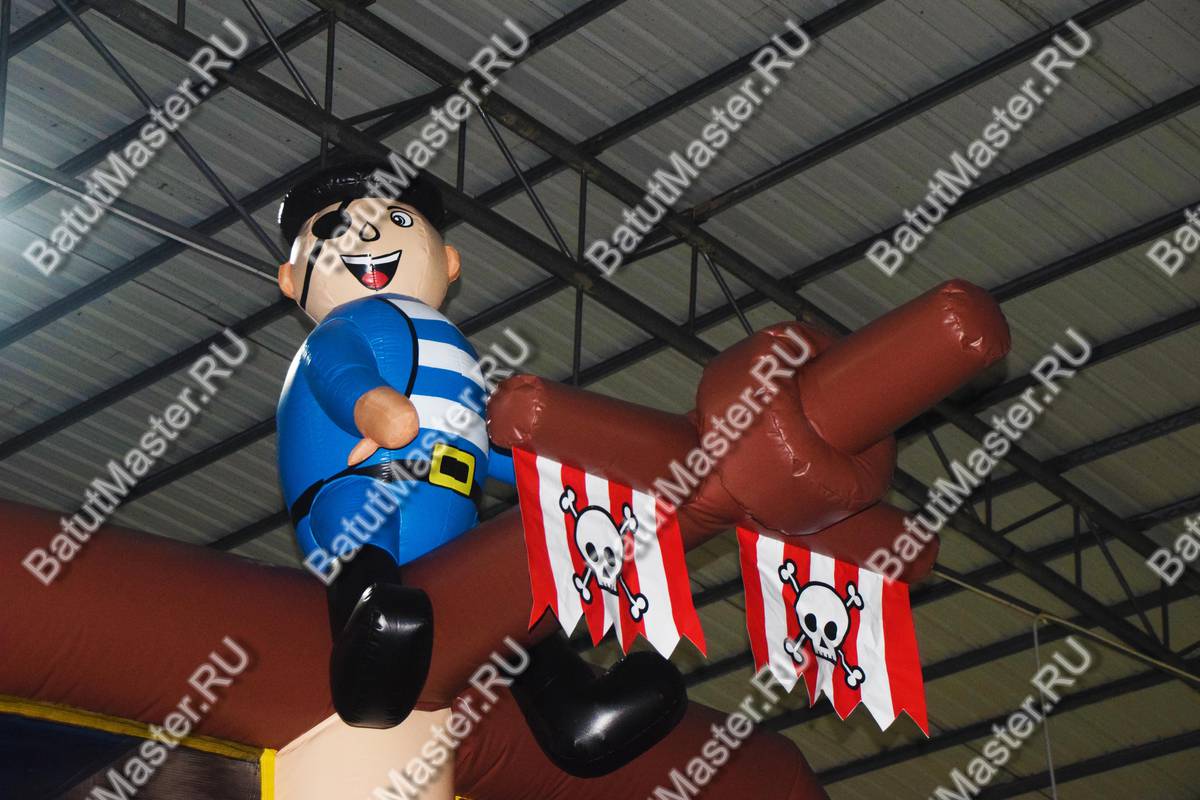 Надувной батут изготовлен в форме настоящего пиратского судна и в доказательство этой тематики на горизонтальной мачте размещается надувная фигура пирата с залихватским выражением лица (прищурив глаз). Вход в коммерческий аттракцион выполнен в виде арки, которая открывает нос надувного судна. Внешние стороны конструкции оборудованы прозрачными окнами из пленки и украшены изображением якоря. Батут закрыт со всех сторон: боковые стороны изготовлены практически из сетки, а верхний навес – из ПВХ.