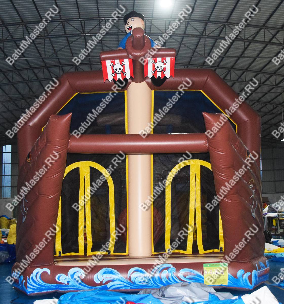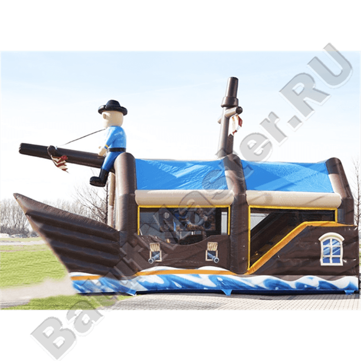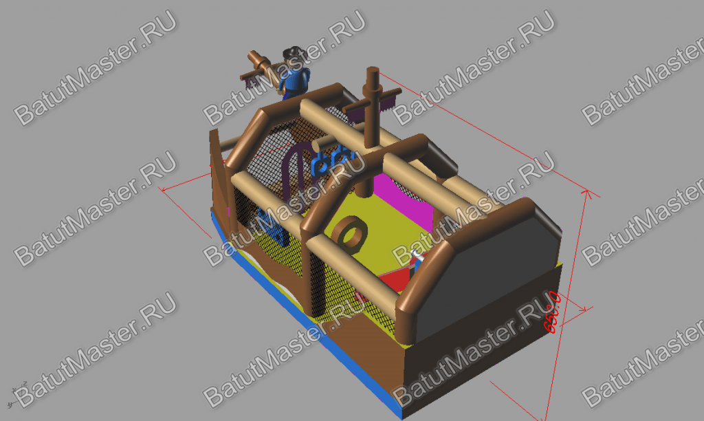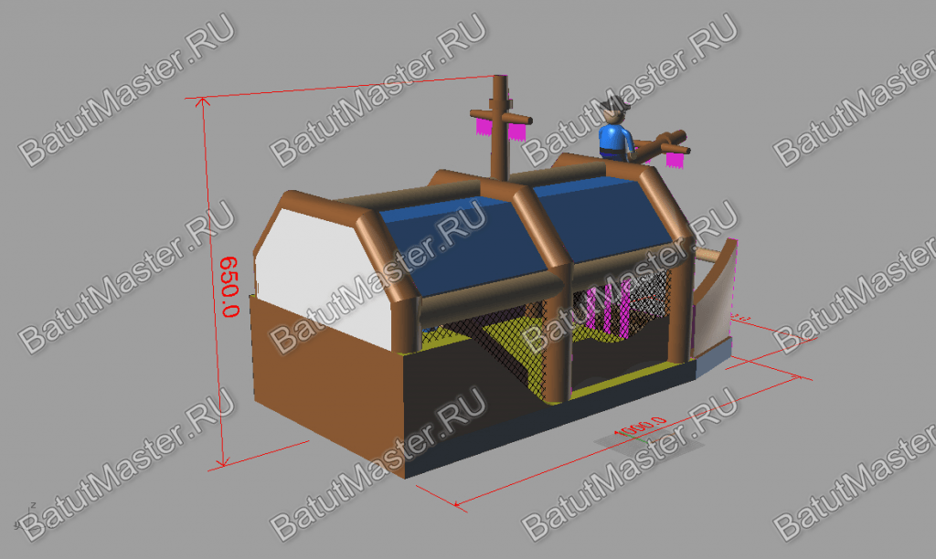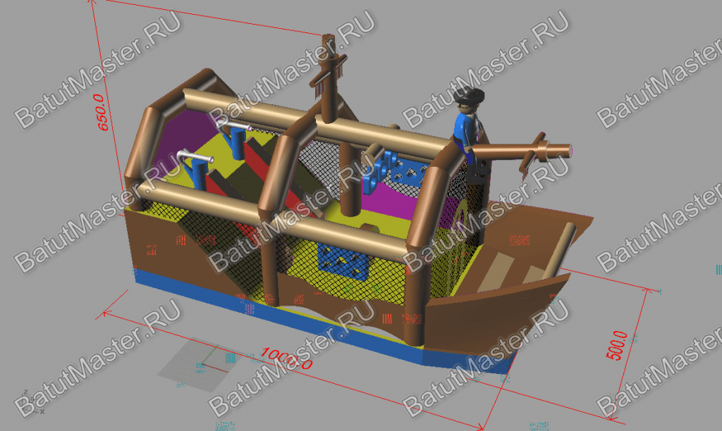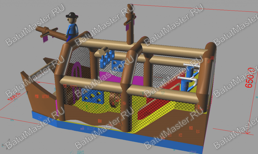 Надувной батут изготовлен в форме настоящего пиратского судна и в доказательство этой тематики на горизонтальной мачте размещается надувная фигура пирата с залихватским выражением лица (прищурив глаз). Вход в коммерческий аттракцион выполнен в виде арки, которая открывает нос надувного судна. Внешние стороны конструкции оборудованы прозрачными окнами из пленки и украшены изображением якоря. Батут закрыт со всех сторон: боковые стороны изготовлены практически из сетки, а верхний навес – из ПВХ.