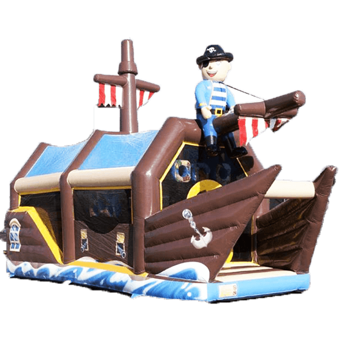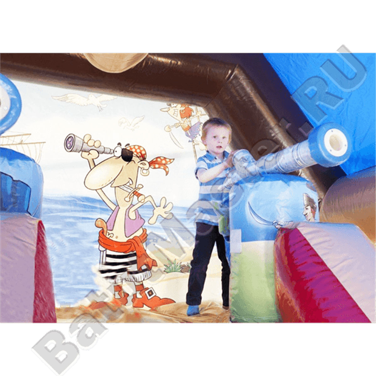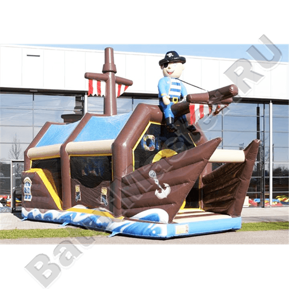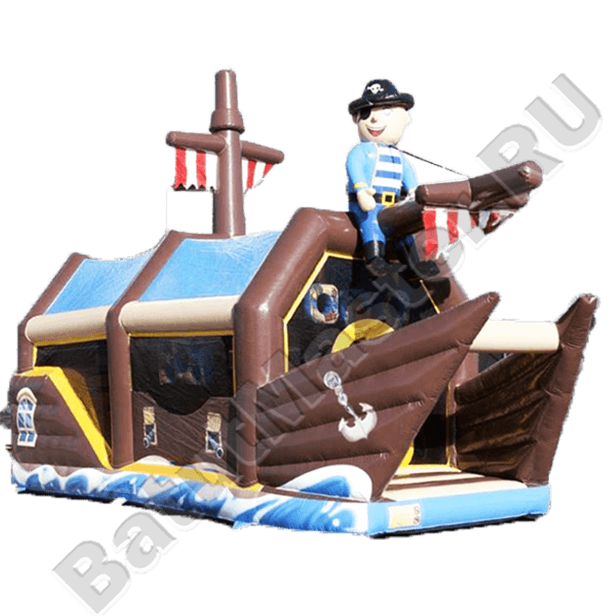 Надувной батут изготовлен в форме настоящего пиратского судна и в доказательство этой тематики на горизонтальной мачте размещается надувная фигура пирата с залихватским выражением лица (прищурив глаз). Вход в коммерческий аттракцион выполнен в виде арки, которая открывает нос надувного судна. Внешние стороны конструкции оборудованы прозрачными окнами из пленки и украшены изображением якоря. Батут закрыт со всех сторон: боковые стороны изготовлены практически из сетки, а верхний навес – из ПВХ.