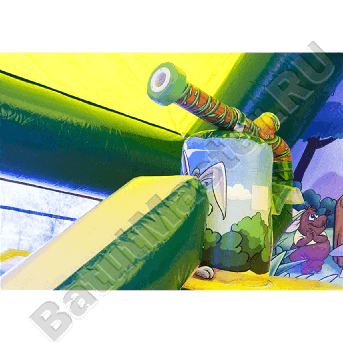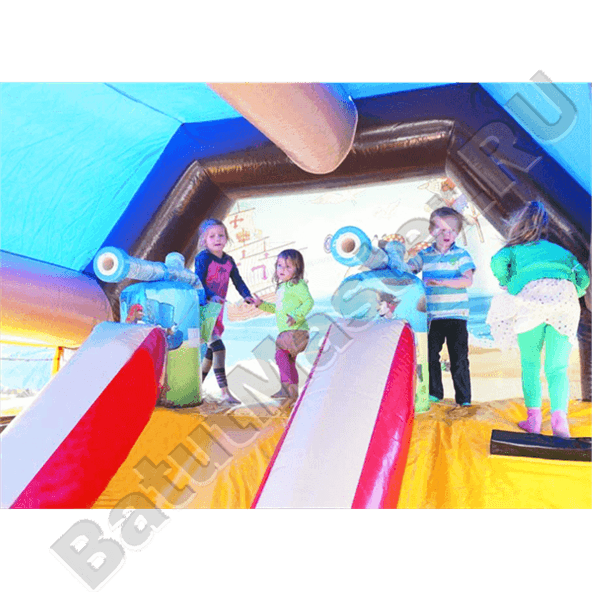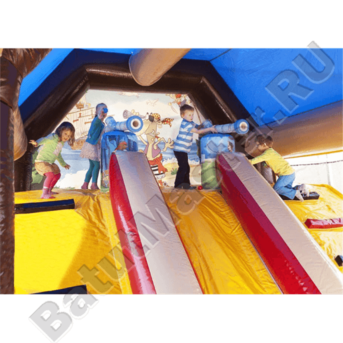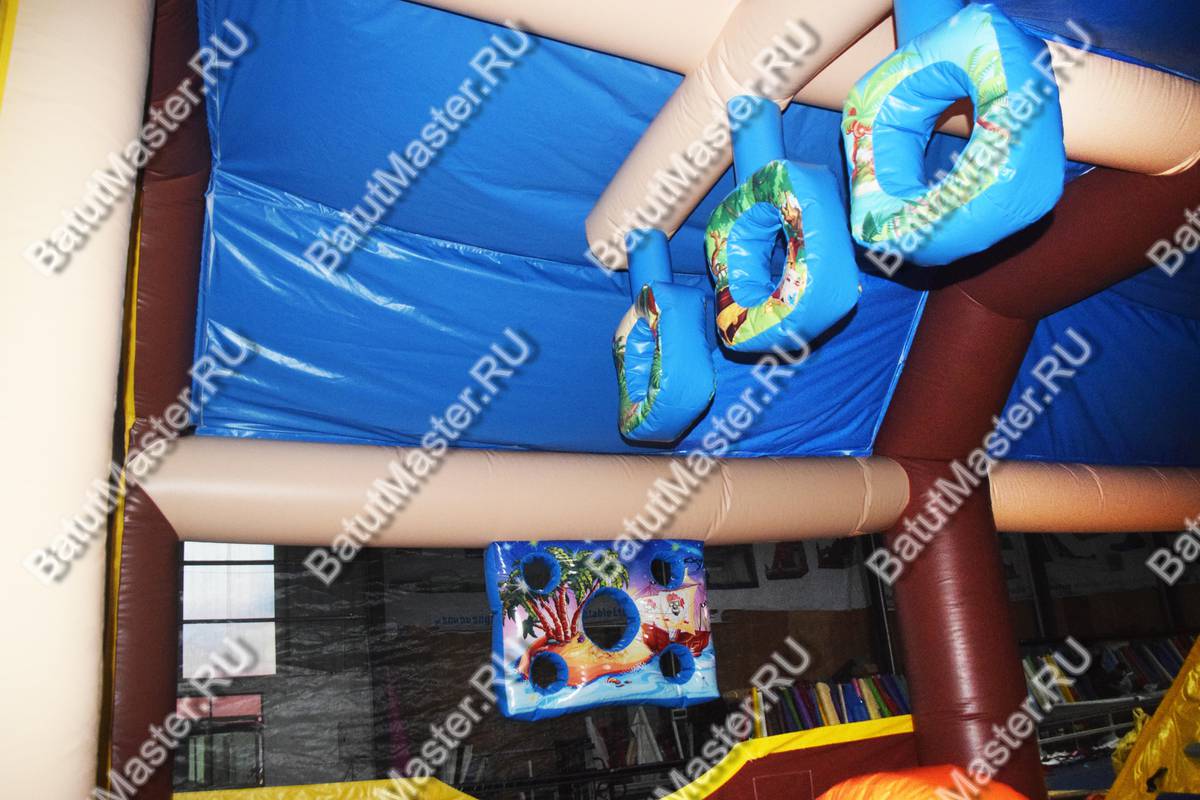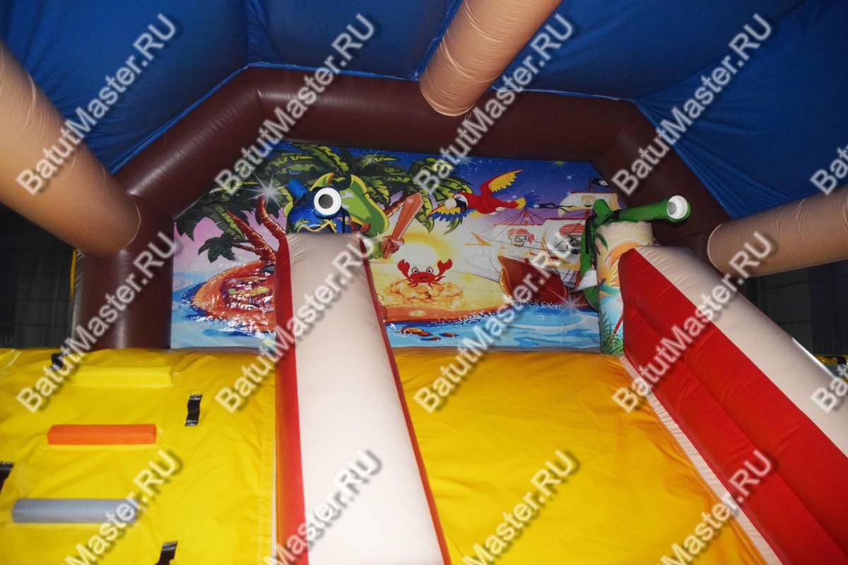 Как только дети окажутся внутри, их будут окружать забавные изображения пиратов из известных мультфильмов, а ближе к задней стенке можно будет взобраться на высокую горку и скатиться с правого или левого спуска.