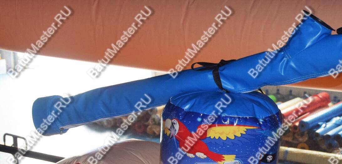 Стартовая площадка этого батута особенно увлекательная, так как на ее надувных подставках размещаются почти настоящие ружья, но только из ПВХ. Из такого оружия каждый желающий ребенок сможет пострелять специальными надувными снарядами. Для этого на противоположной стороне батута размещаются «цели» в виде трех мишеней, внутри которых есть отверстия. В это отверстие и должен попасть отправившийся сгорки снаряд.