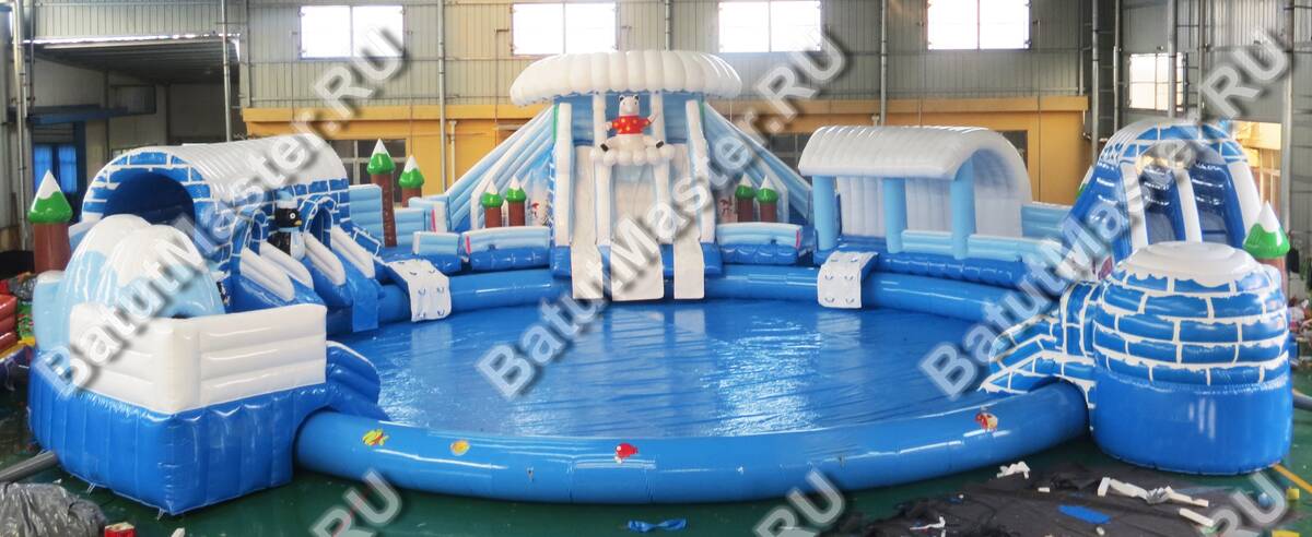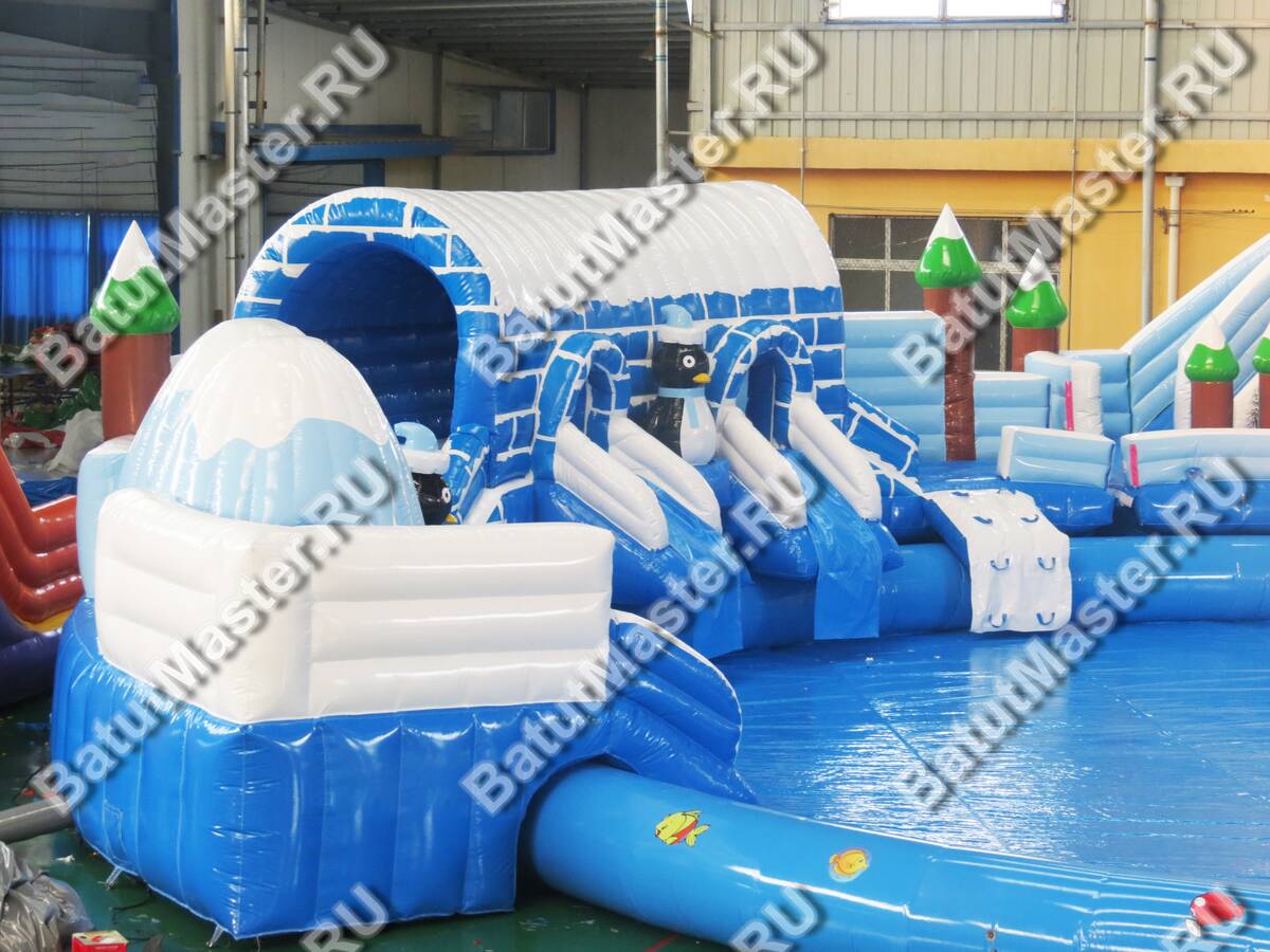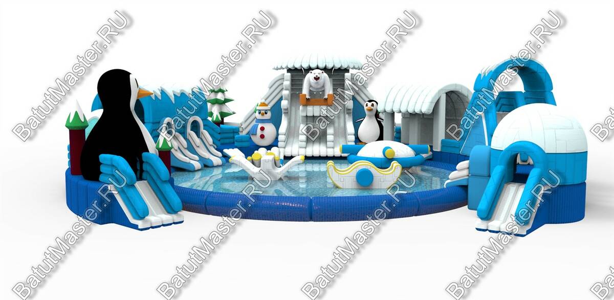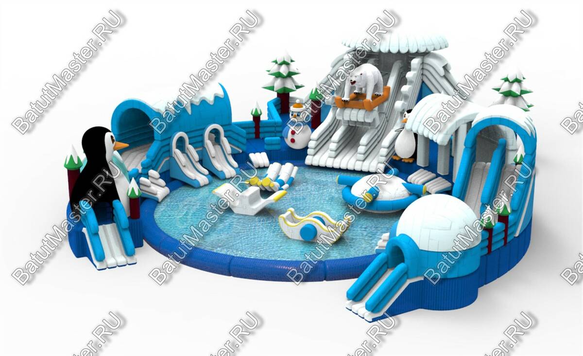 Надувной наземный аквапарк «Морское царство 3» — это полноценная коммерческая площадка для водных развлечений, созданная для интенсивной летней эксплуатации и стабильного денежного потока. Габариты 16x16x6 м позволяют сформировать заметную доминанту на любой локации — от городского пляжа и загородного клуба до торгово-развлекательного центра с зоной под открытым небом. Центральный визуальный акцент — крупная декоративная фигура пингвина и зимняя стилизация с сочетанием синего, голубого и белого цветов. Такая тематика моментально притягивает внимание семейной аудитории, повышает конверсию проходящего трафика и облегчает продвижение в соцсетях благодаря фотогенике площадки.