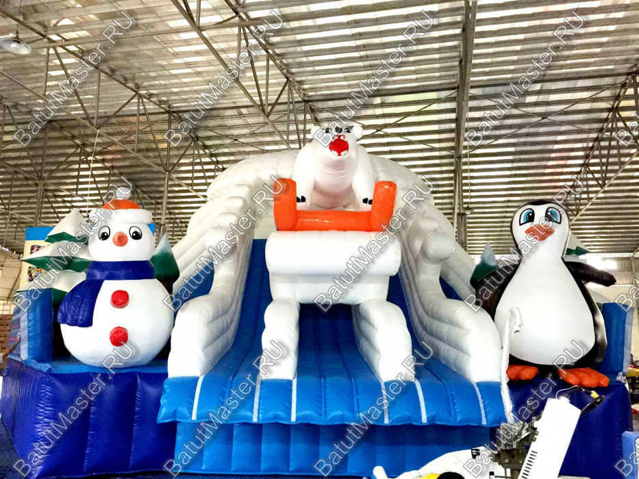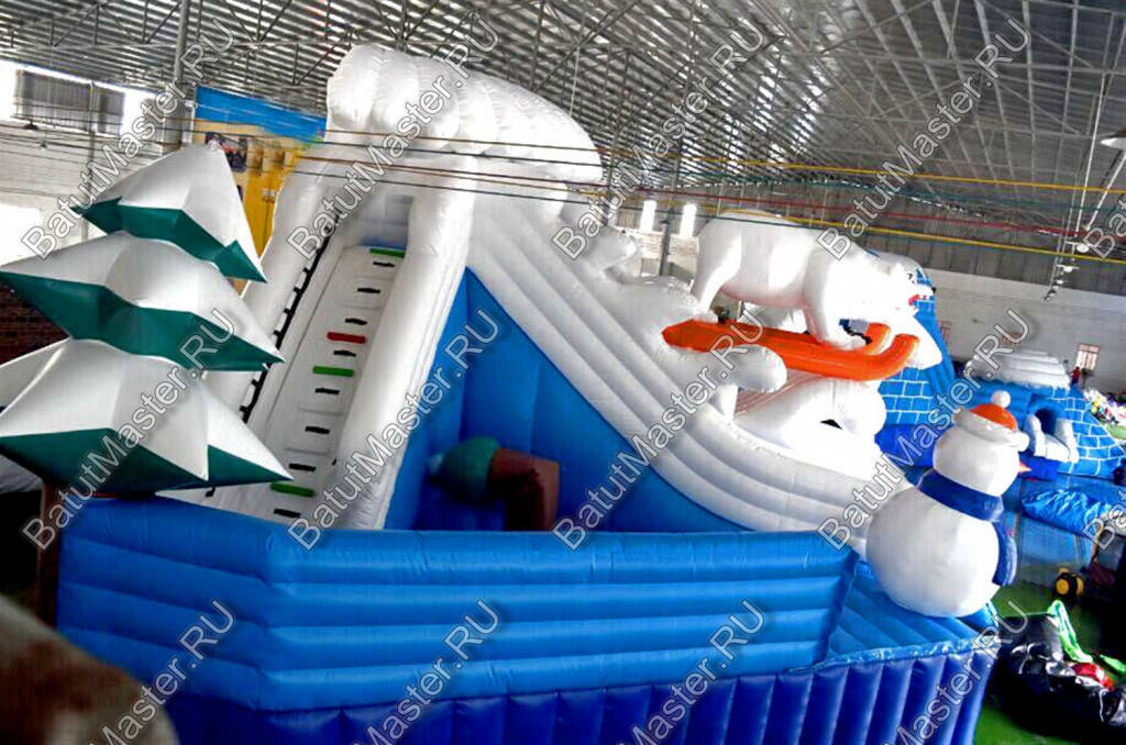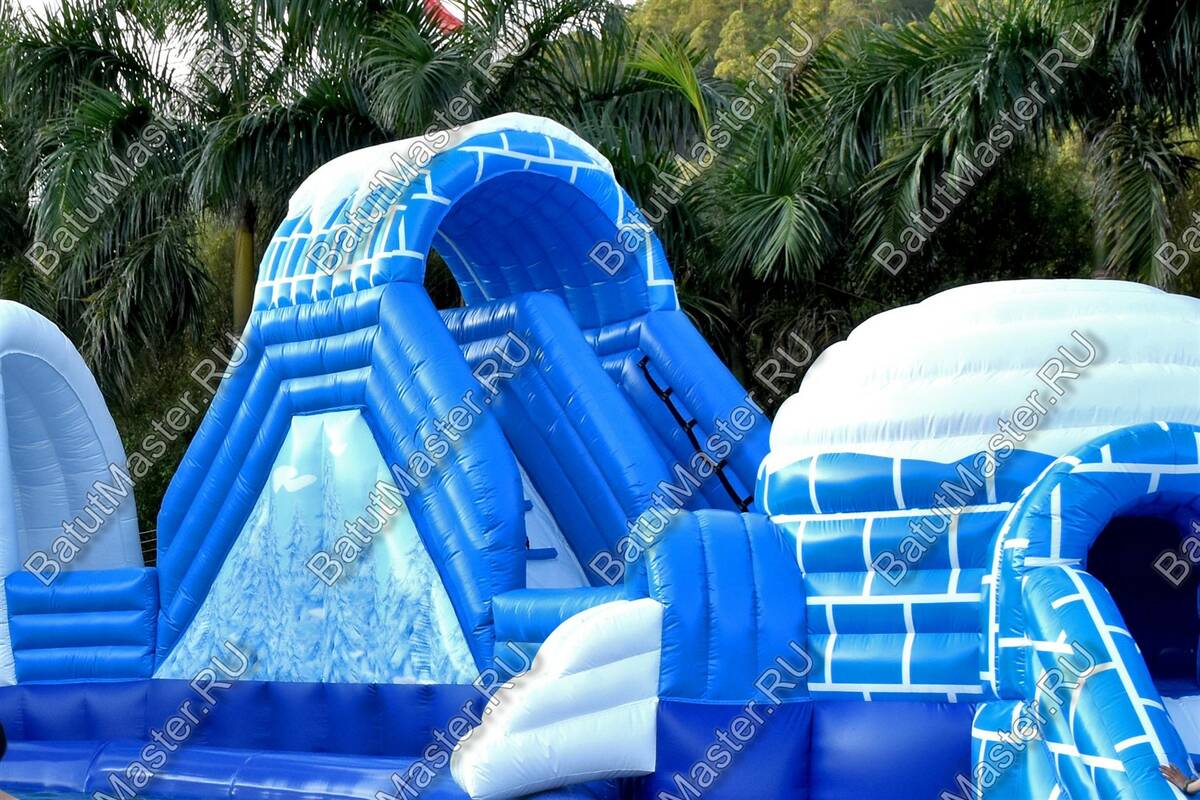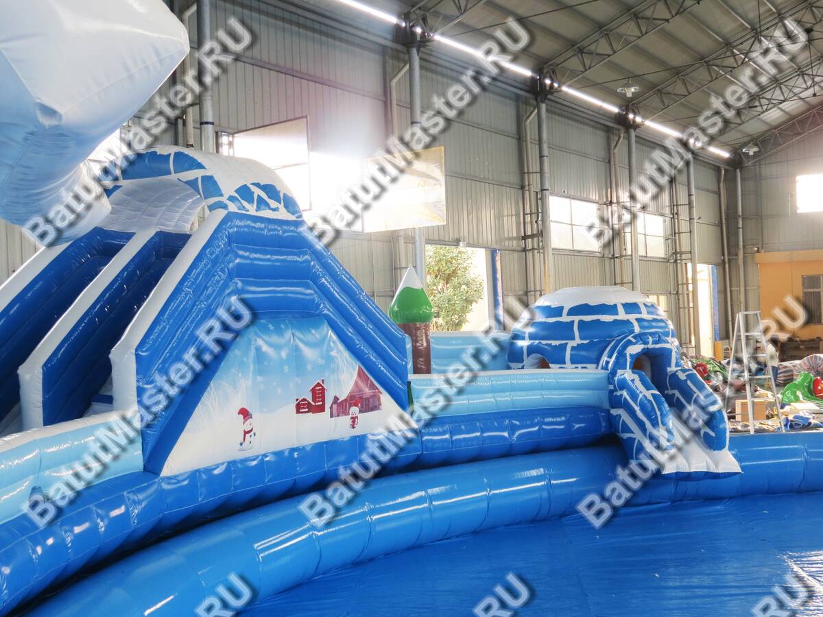 Надувной наземный аквапарк «Морское царство 3» — это полноценная коммерческая площадка для водных развлечений, созданная для интенсивной летней эксплуатации и стабильного денежного потока. Габариты 16x16x6 м позволяют сформировать заметную доминанту на любой локации — от городского пляжа и загородного клуба до торгово-развлекательного центра с зоной под открытым небом. Центральный визуальный акцент — крупная декоративная фигура пингвина и зимняя стилизация с сочетанием синего, голубого и белого цветов. Такая тематика моментально притягивает внимание семейной аудитории, повышает конверсию проходящего трафика и облегчает продвижение в соцсетях благодаря фотогенике площадки.