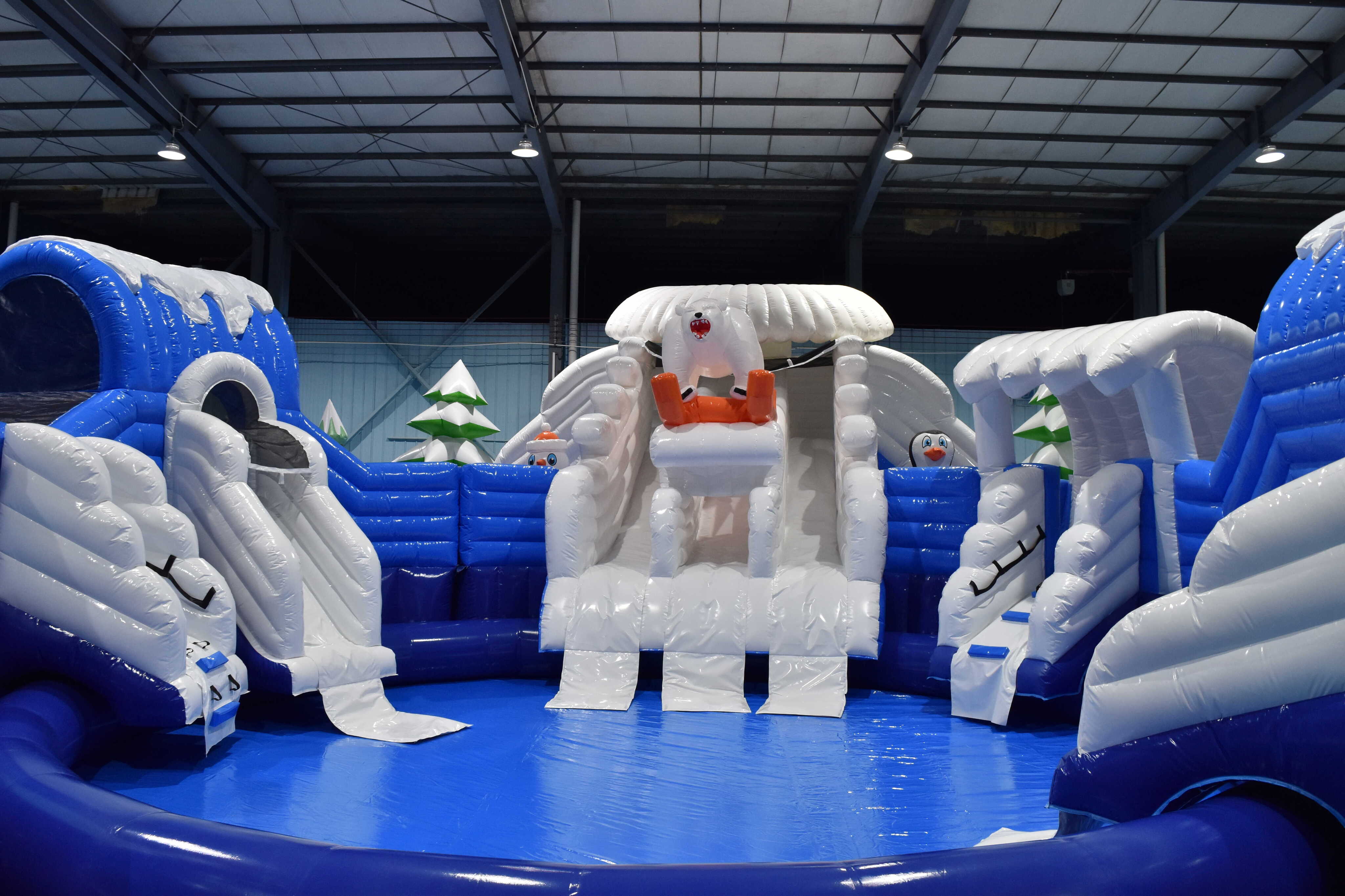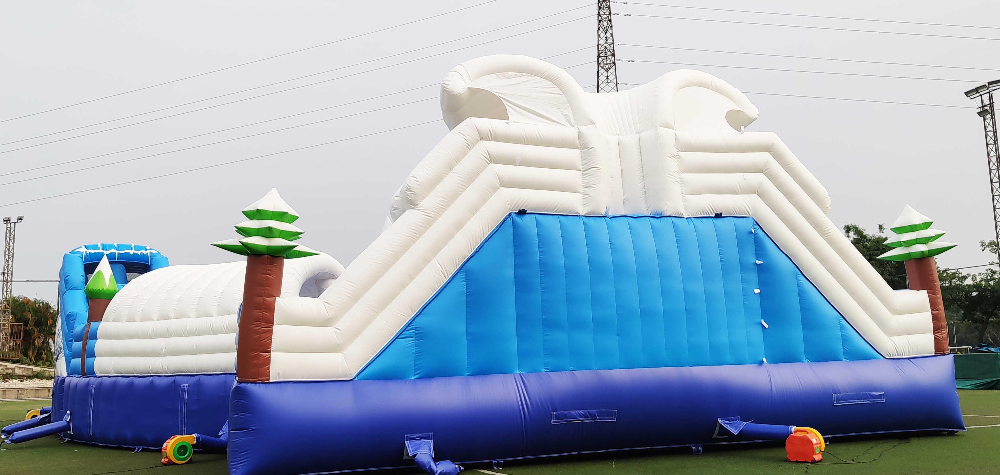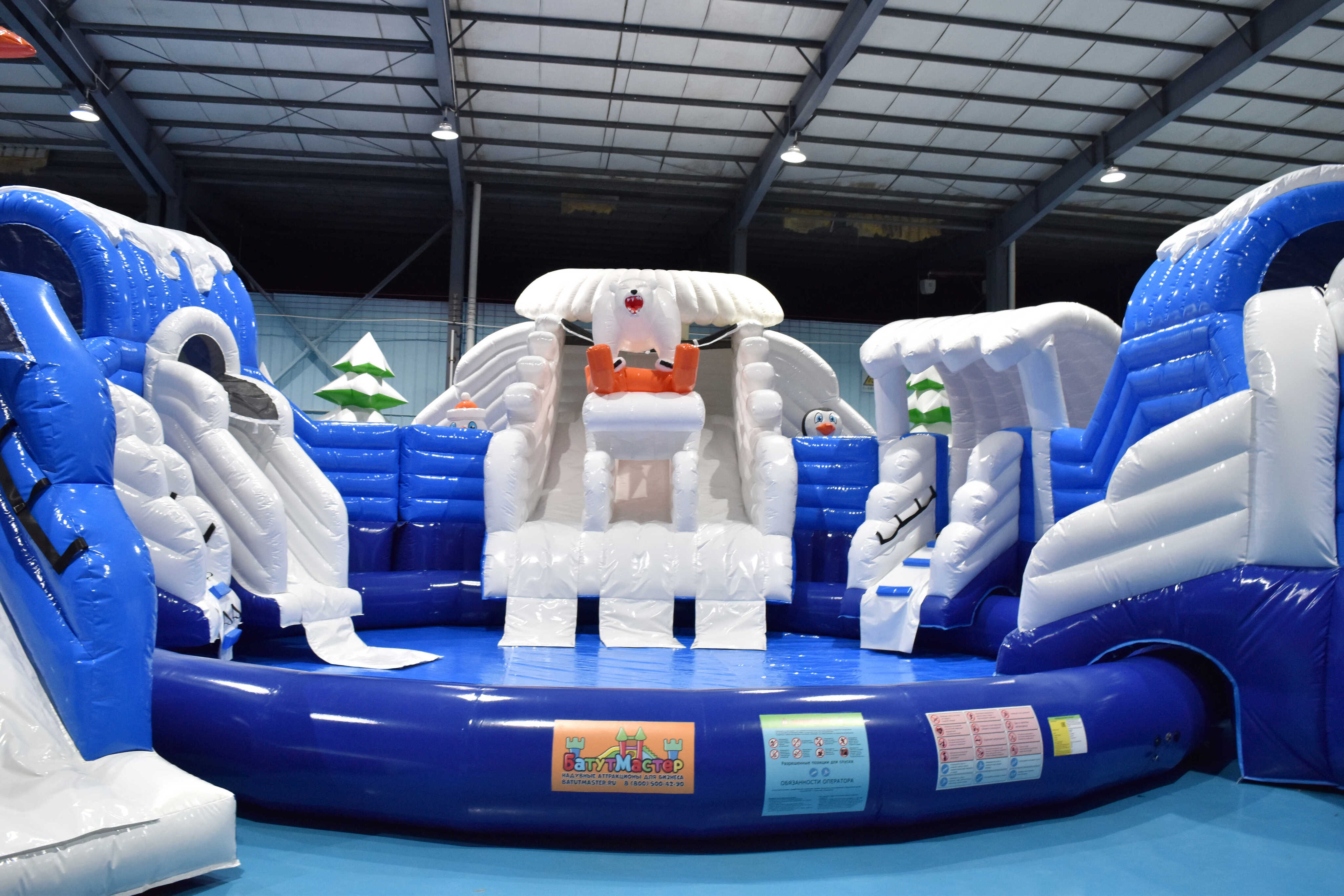 Каркасные элементы отсутствуют: аттракцион — это система герметичных камер из износостойкой ПВХ-ткани, которые поддерживаются вентилятором в рабочем режиме. Это минимизирует требования к техобслуживанию и ускоряет ввод в эксплуатацию: монтаж и демонтаж выполняются штатной командой персонала, без тяжелой техники и долгой подготовки площадки. На практике это означает быструю ротацию локаций: от городских праздников и фестивалей до корпоративов на природе, детских мероприятий и сезонных промо в торгово-развлекательных центрах с открытыми бассейнами на крыше.
