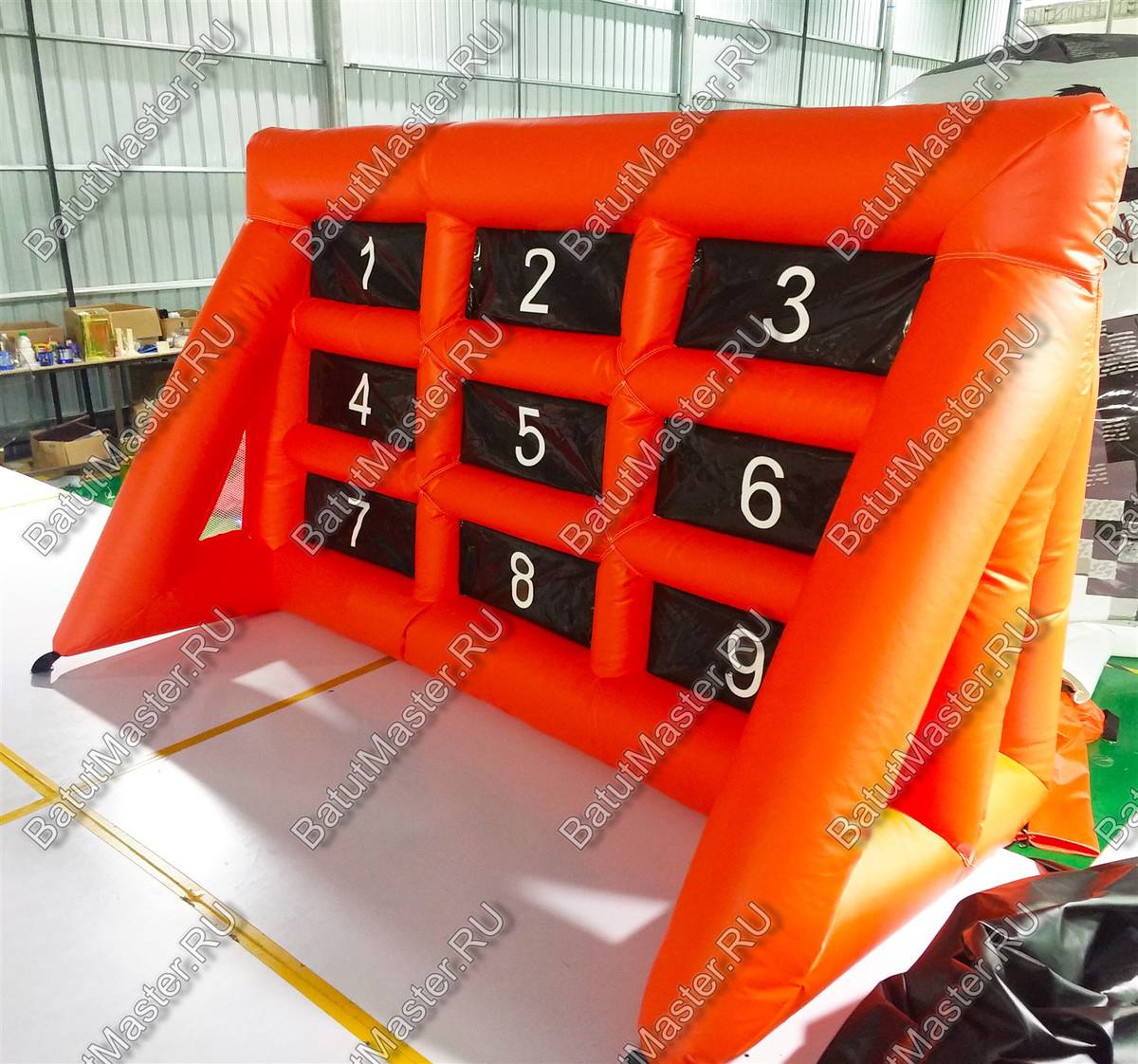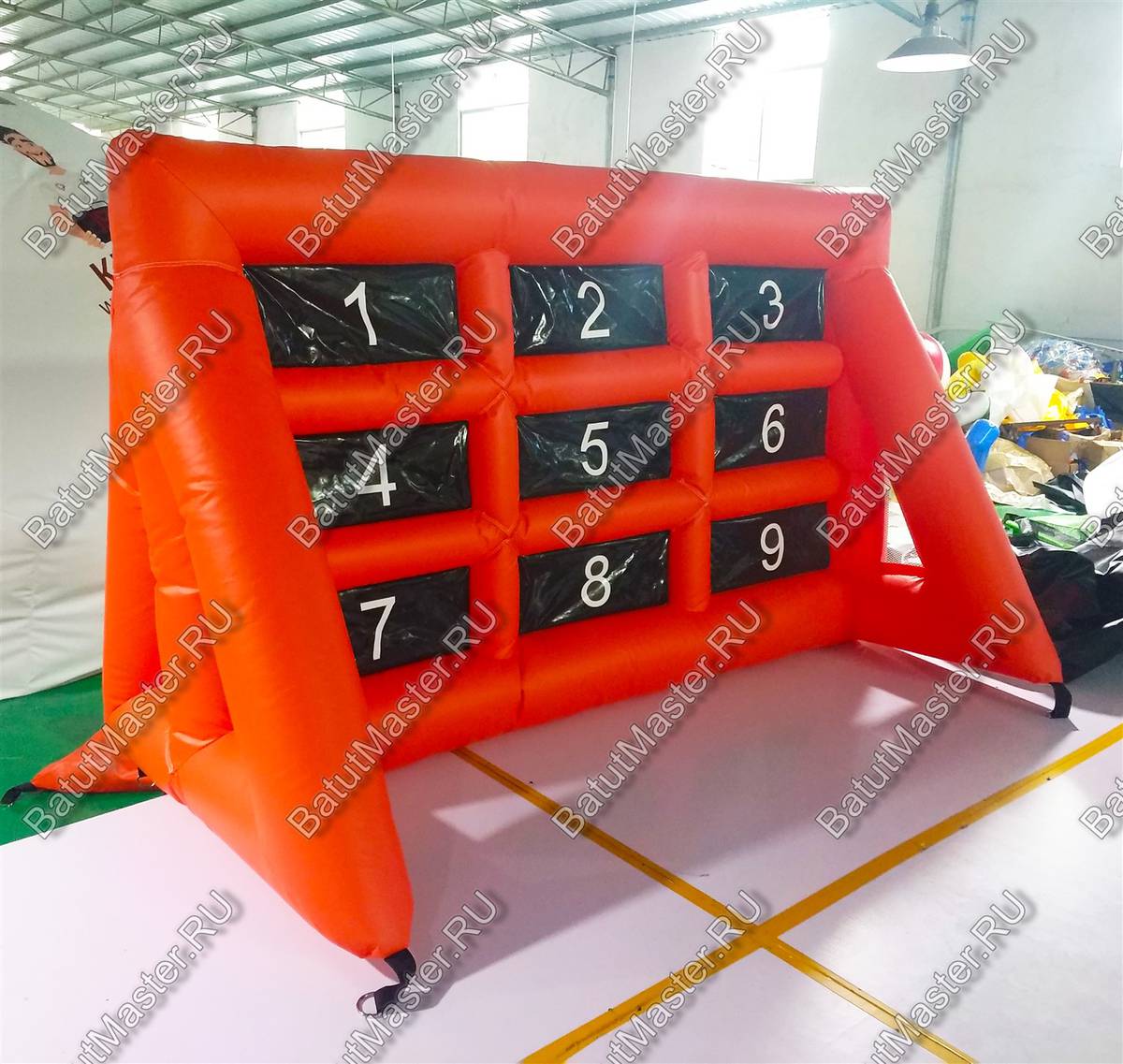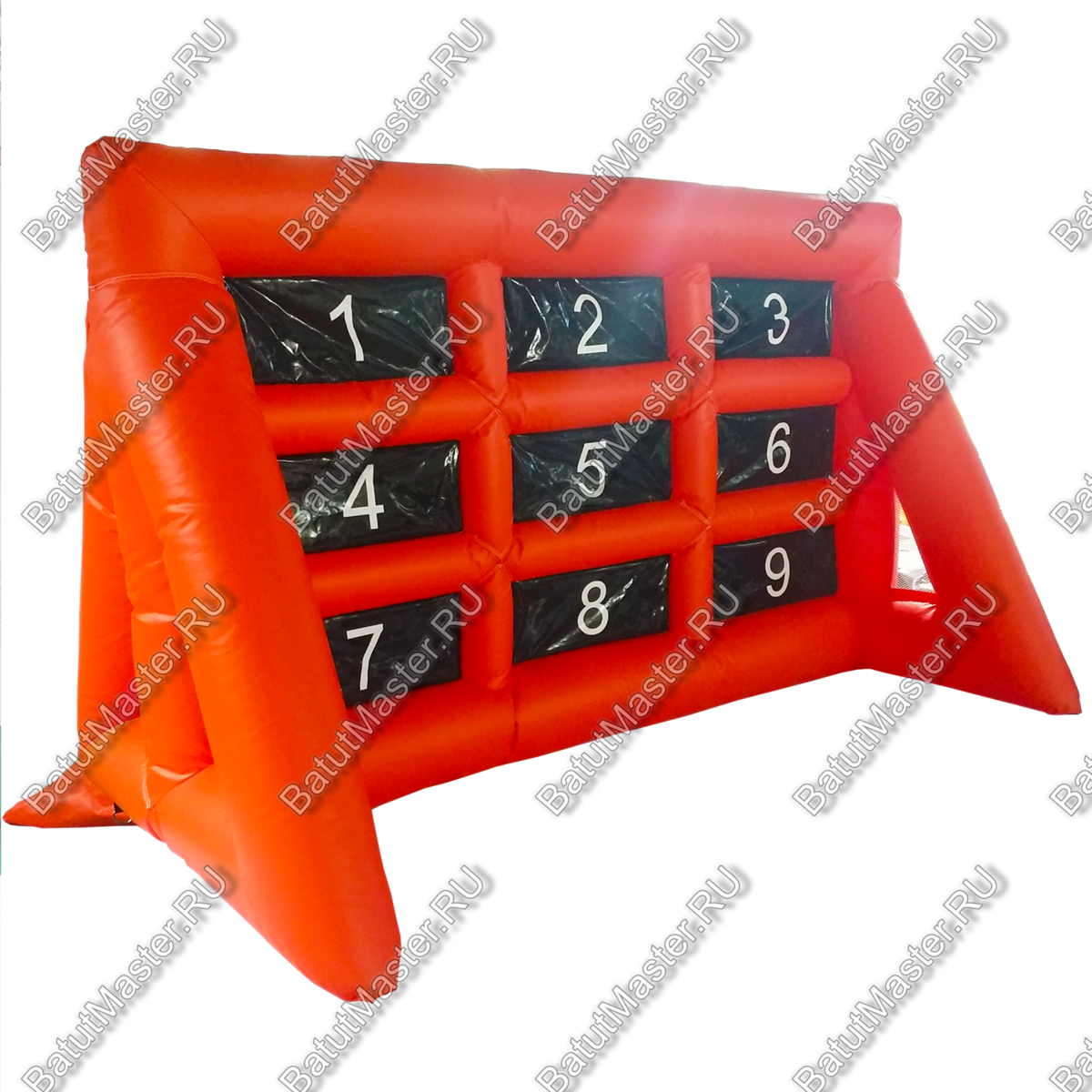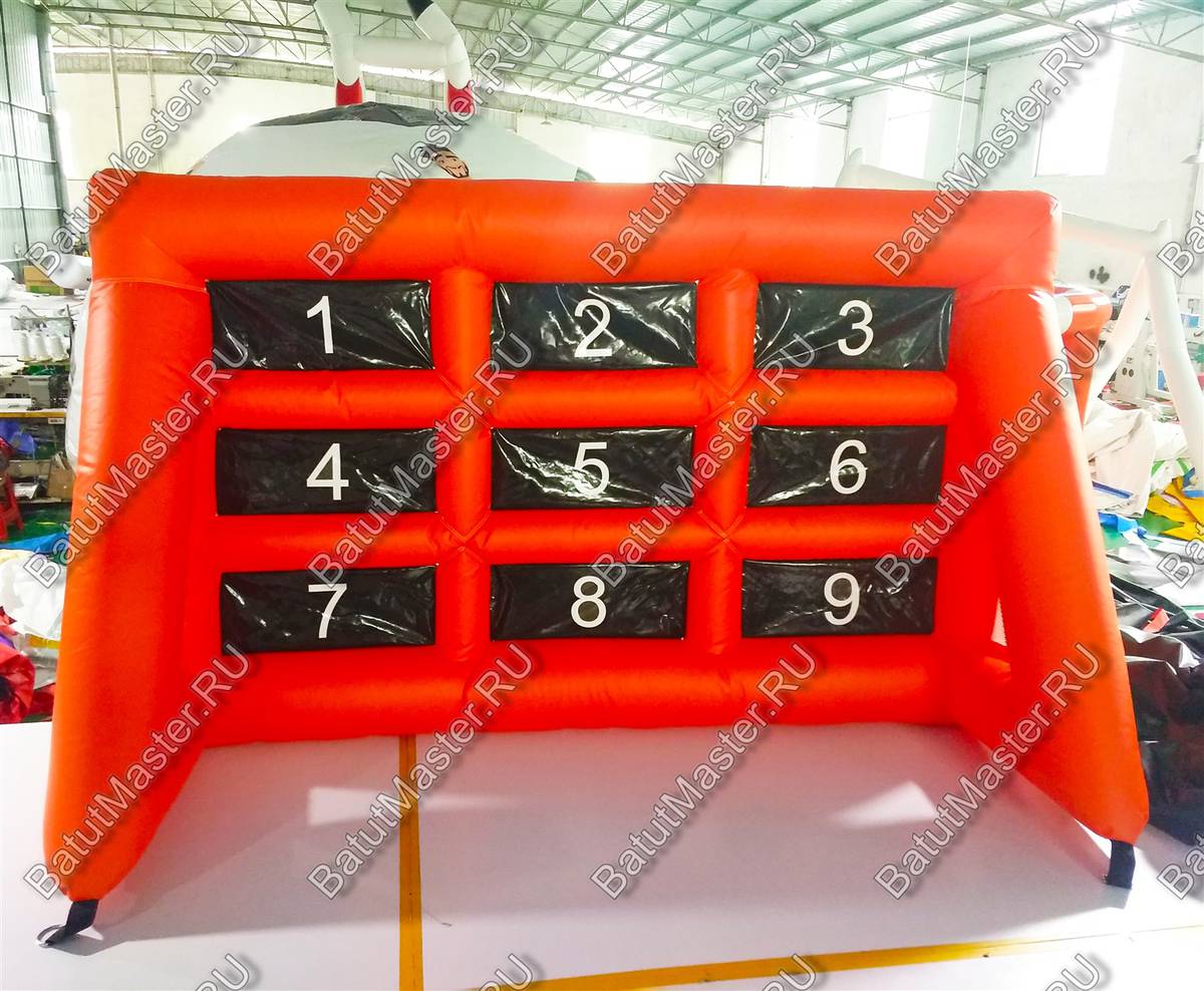 Надувная игра «Футбольные ворота 2» сделана как настоящая конструкция, в которую обычно забивают мяч, однако при использовании ее, правила немного меняются. Здесь имеется табло с цифрами от одного до девяти. Тому участнику игры, который забивает мяч в определенную ячейку и присваивается количество очков. Играть можно до бесконечности, как на пару, так и двумя командами. Можно также придумывать свои правила.