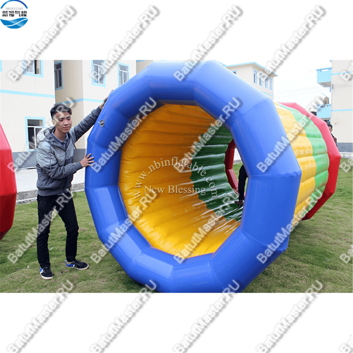 Роллер — это надувной цилиндр, в котором участники бегут внутри, как хомячки в колесе, заставляя конструкцию катиться по земле. Отлично подходит для соревнований, тимбилдингов и активных игр.